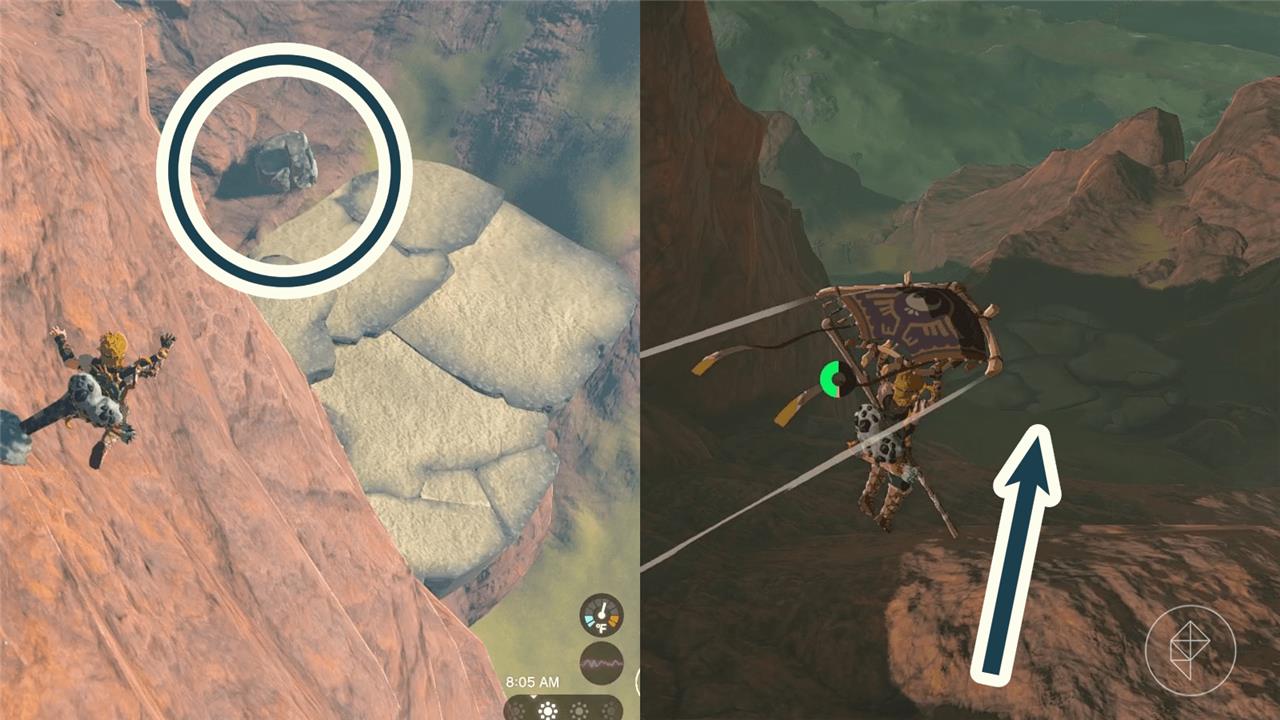 On the east and west side of the tower, pieces of rubble will fall from the sky and land on the stone platforms. Jump onto any of the pieces of the rubble and use Recall on it to rewind it into the sky. Glide off at the peak and dive into the hole at the top of the tower. Make sure to redeploy your paraglider before you land (so you don’t take a ton of fall damage), and activate the tower to reveal a portion of the map.