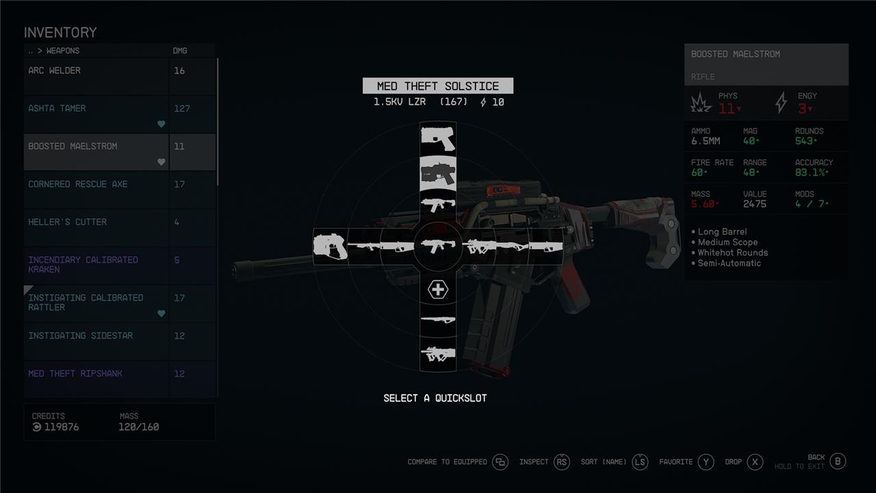 In Starfield, you aren’t limited to just one weapon at a time-you can equip and quickly access multiple weapons for different combat situations. To do this, open your inventory, navigate to the Weapons section, and mark your chosen guns as “Favorites” (press B on PC or Y on Xbox controller). This action brings up the quickslot or weapon wheel menu, where you can assign each weapon to a specific slot. During gameplay, you can then instantly swap between your favorited weapons by pressing the corresponding hotkey (1-9, Z, [ ] on PC) or using the D-pad on Xbox, letting you adapt on the fly without pausing the action. This system is essential for managing different ammo types and combat scenarios, ensuring you’re always ready for whatever the galaxy throws at you.