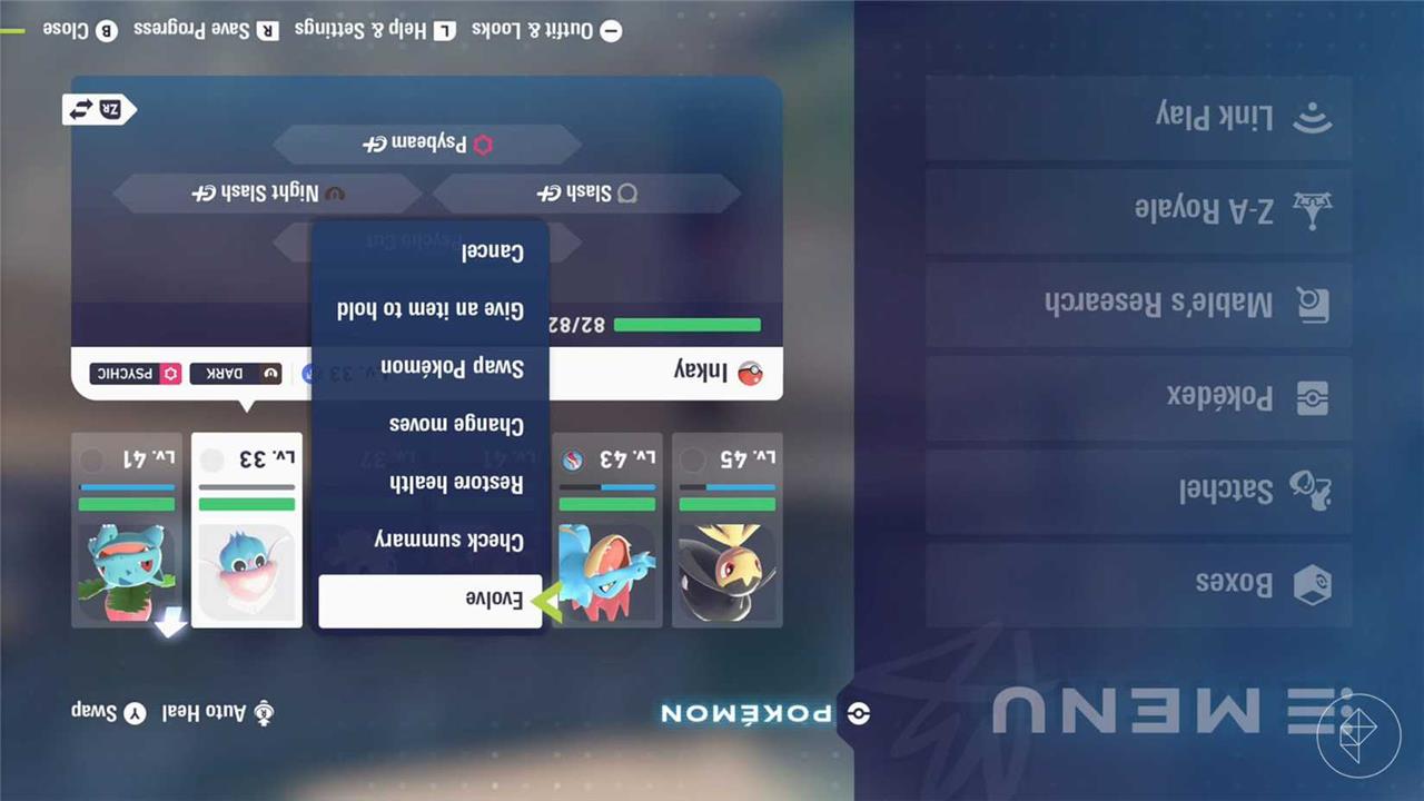 Now that that’s all squared away, to evolve your Inkay, you’ll need to flip your console upside-down. Yup, you heard that right. Flip that bad boy over and open your menu. You won’t see an arrow indicating that Inkay is ready to evolve, but if you select Inkay, you’ll see an “Evolve” option. Your screen should look a little something like this: