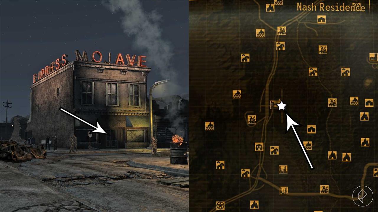 Go to Primm, the town south of Goodsprings, and enter the Mojave Express building, which is the one with the big red neon letters (called “Nash Residence” on the map). Repair the broken robot on the counter through one of the following methods: