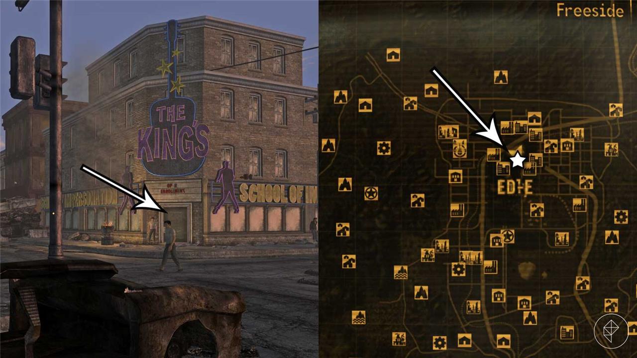 Arcade resides in the Old Mormon Fort in Freeside. Fast-travel to Freeside’s north gate and it’ll be on the left as you walk into Freeside. To recruit Arcade, you must meet one of the following requirements: