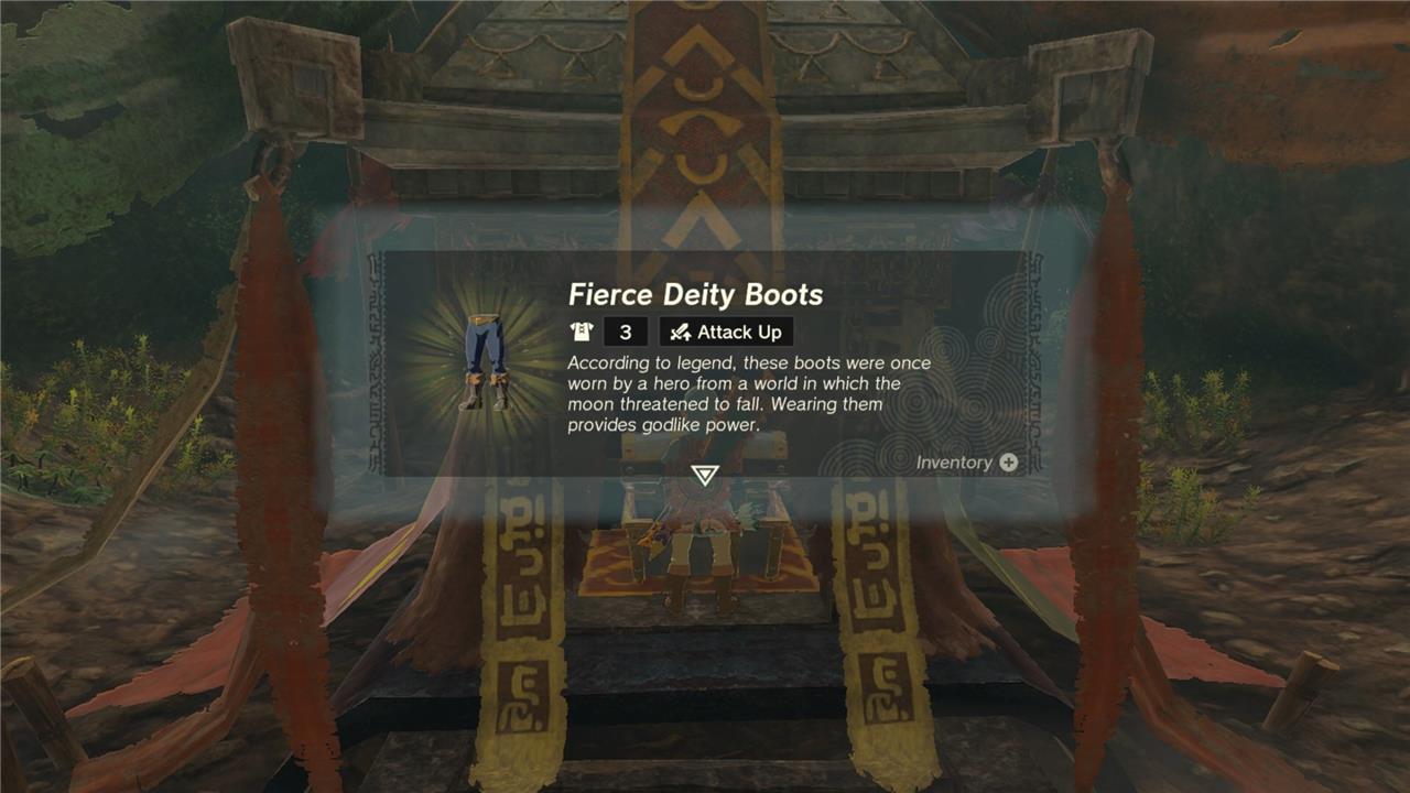 | Fierce Deity Boots | 1 Farosh’s scale, 5 Hinox toenails, 10 rupees | 1 Farosh’s claw, 5 Hinox teeth, 50 Rupees | 1 Shard of Farosh’s fang, 2 Hinox guts, 200 rupees | 1 Farosh’s horn, 2 Lynel guts, 500 rupees |