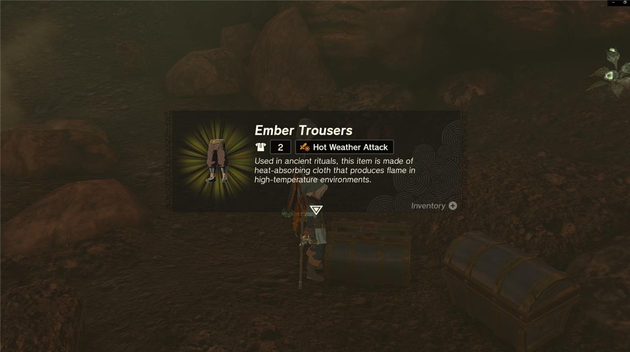 Feed their dog, who is lounging near their tent, and it will lead you to the correct chest. We fed the canine four apples (there are two on the nearby wooden box, if you’re running low) and the dog guided us to a dirt-covered chest, inside of which rested the Ember Trousers, which allow for a Hot Weather Attack.