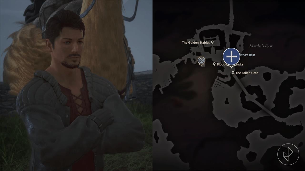 Complete the “Release” sub-mission in “The Gathering Storm” and report back to Martha at the Golden Stables. Exit the tavern to spot the green “+” quest marker near the bridge.