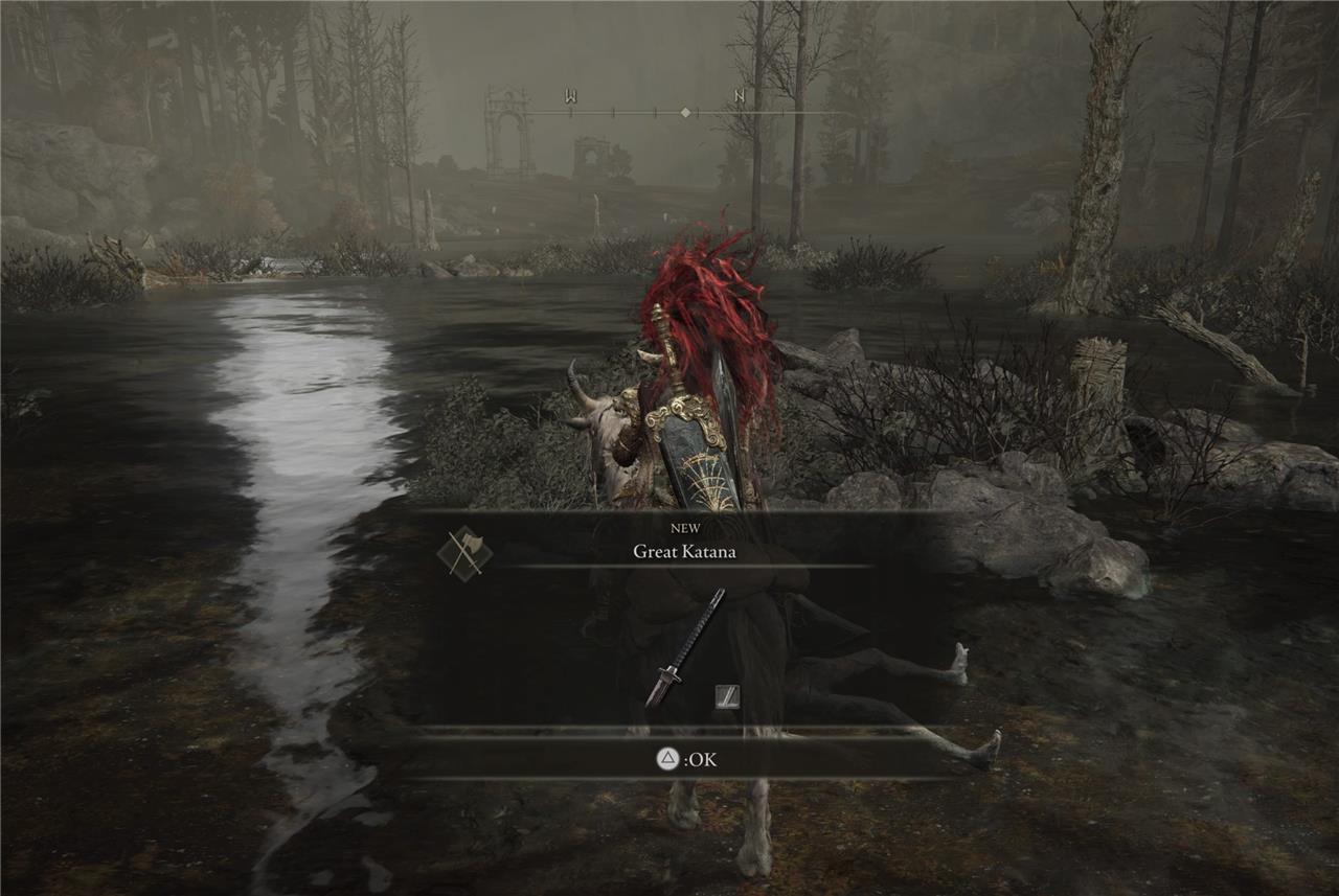 Follow the main road in Gravesite Plain to the Three-Path Cross Site of Grace, then head north to the lake. Defeat the massive Ghostflame Dragon that’s resting in the lake and then ride around until you find a dead body next to a pile of debris. Loot the body and you’ll find the basic Great Katana.