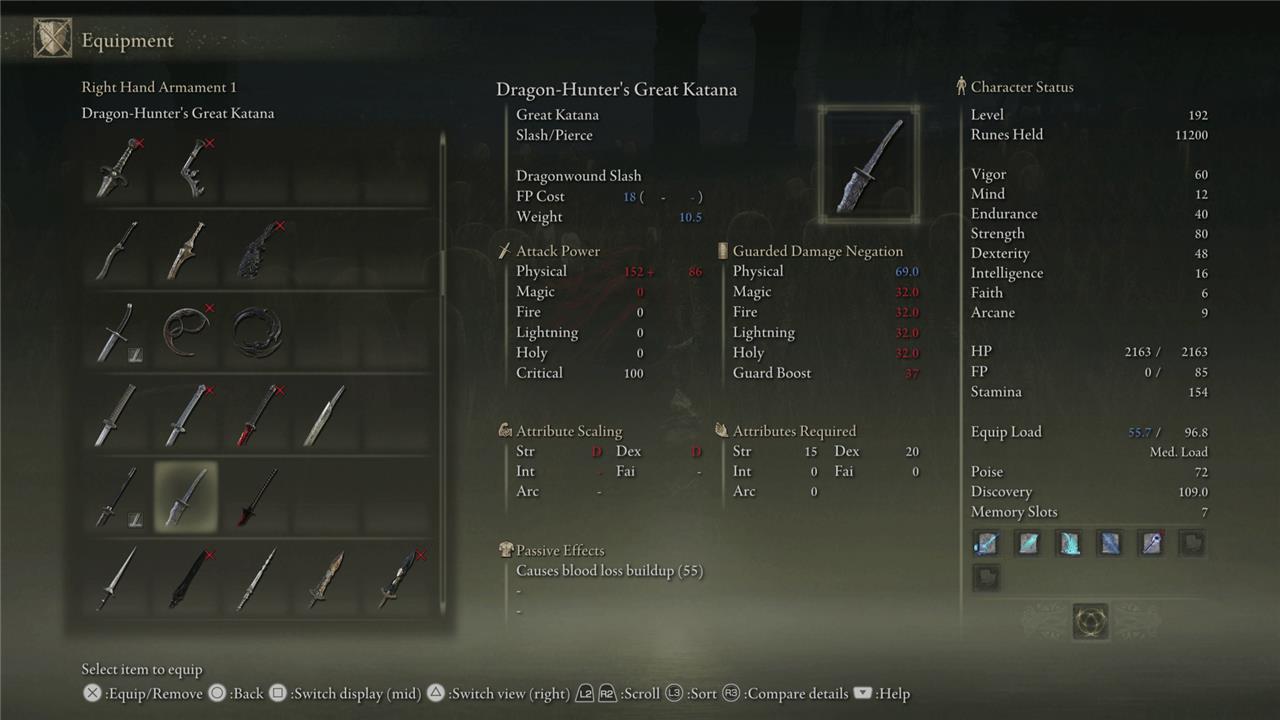 • Dragon Hunter’s Great Katana: The Dragon Hunter’s Great Katana scales with STR and DEX and also deals blood loss. It does more damage against draconic enemies.