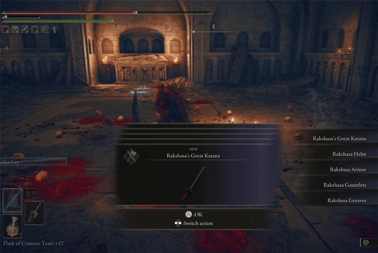 Rakshasa’s Great Katana is found in the Eastern Nameless Mausoleum, located in Scadu Atlus within the Shadow of the Erdtree DLC of Elden Ring. To reach it, players must first navigate the hidden path from Shadow Keep to the Castle Watering Hole Site of Grace by descending a ladder near the flaming boats. From there, continue south past the Recluses’ River Upstream and Downstream Sites of Grace, then jump down stone platforms to a river section between two waterfalls. Heading east along this path leads to the mausoleum where the boss Rakshasa awaits. Defeating Rakshasa rewards players with this powerful Great Katana, known for its blood-stained blade and unique ability to reduce stagger from counterattacks while increasing damage taken.