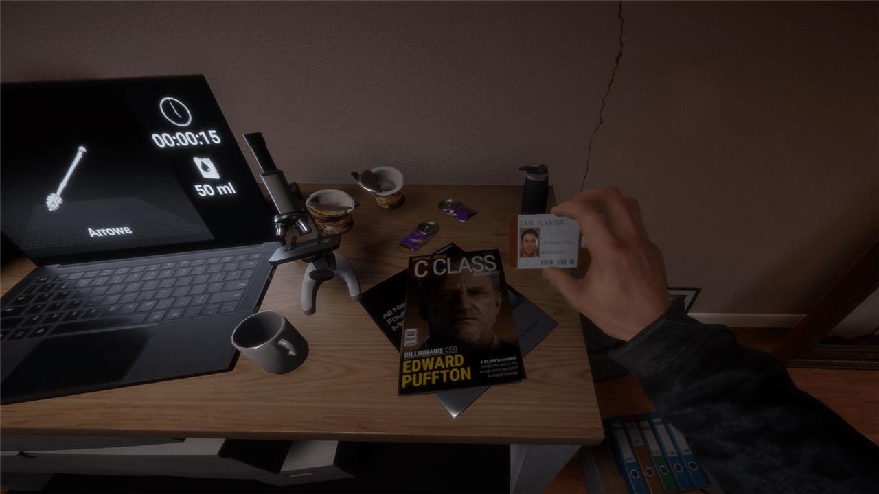 7. Climb the stairs to find a security room, and collect the VIP keycard on the desk in front of the camera TVs. There is also an email to collect on the table to the left.
