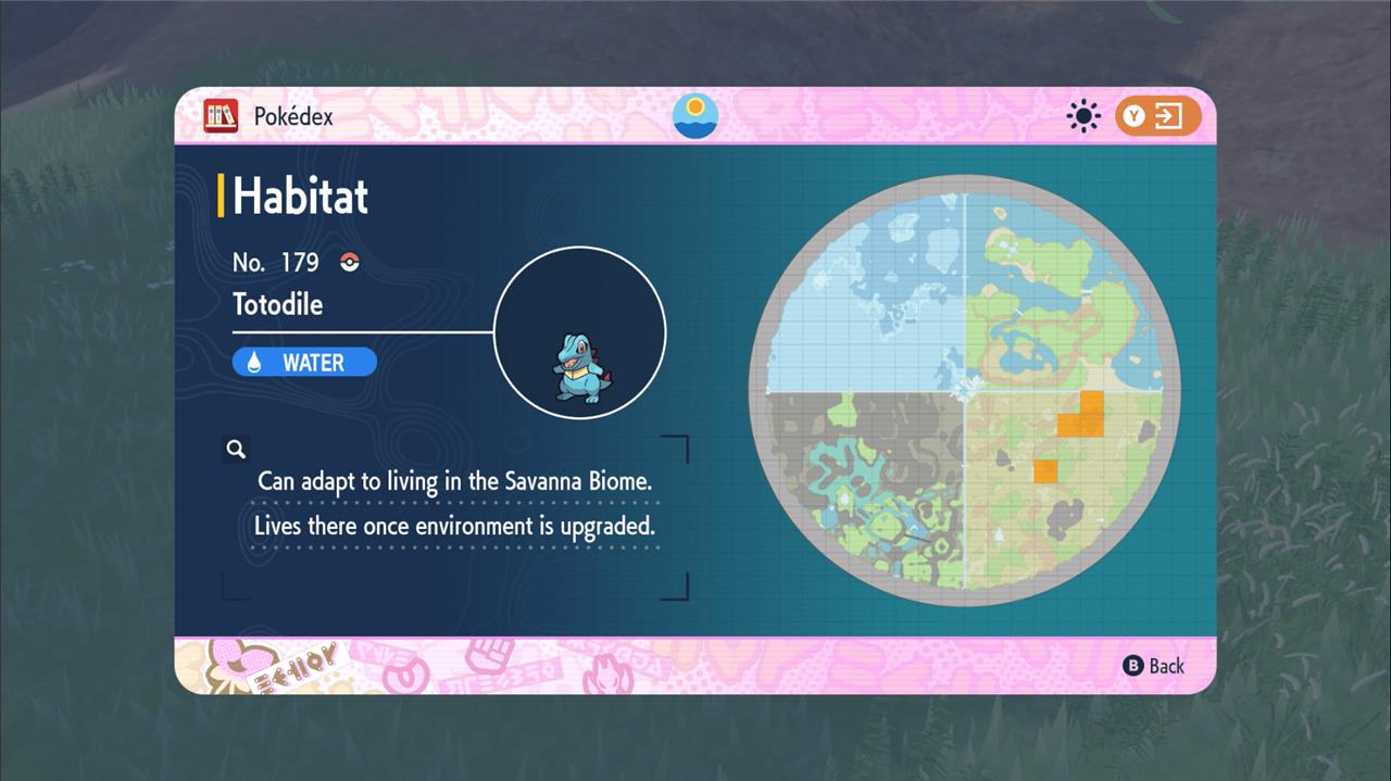 Totodile can be found in some of the swampy pools in the Savannah Biome.