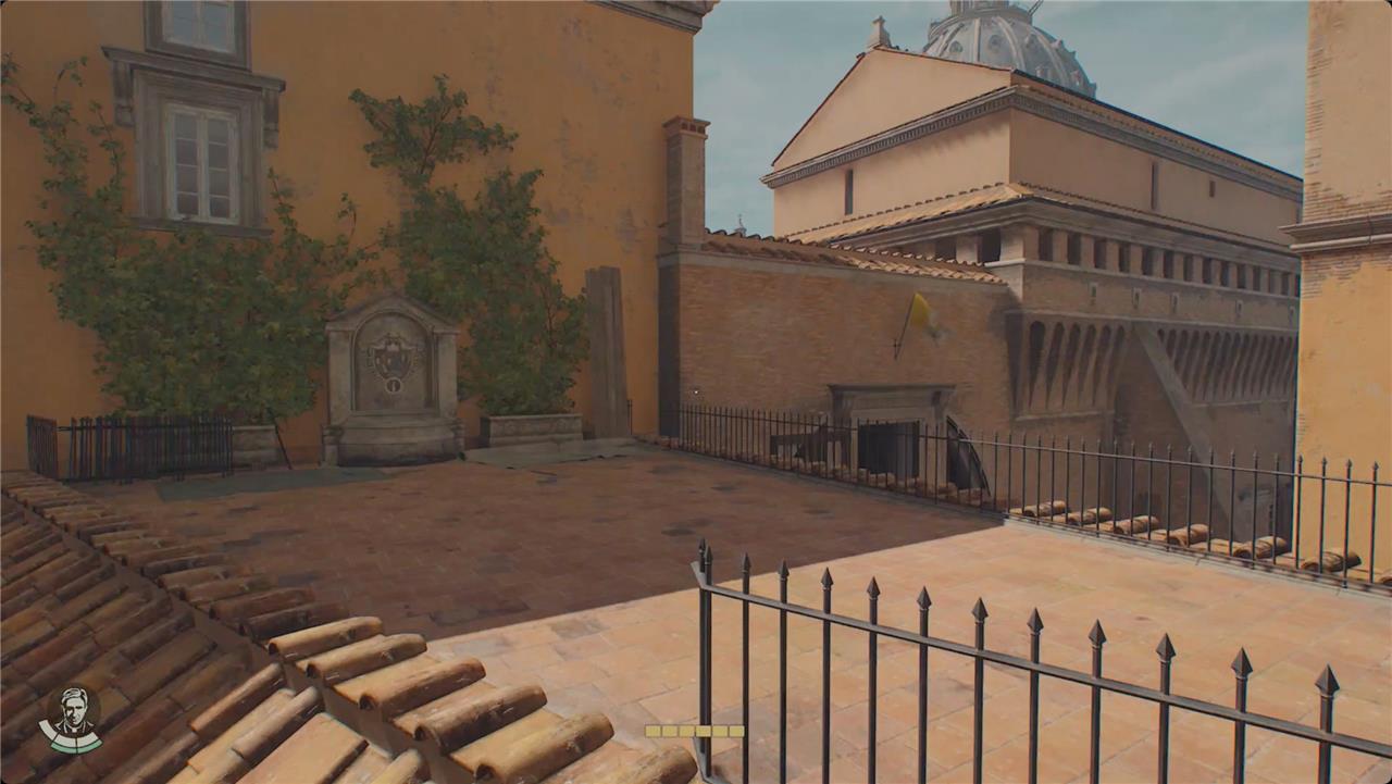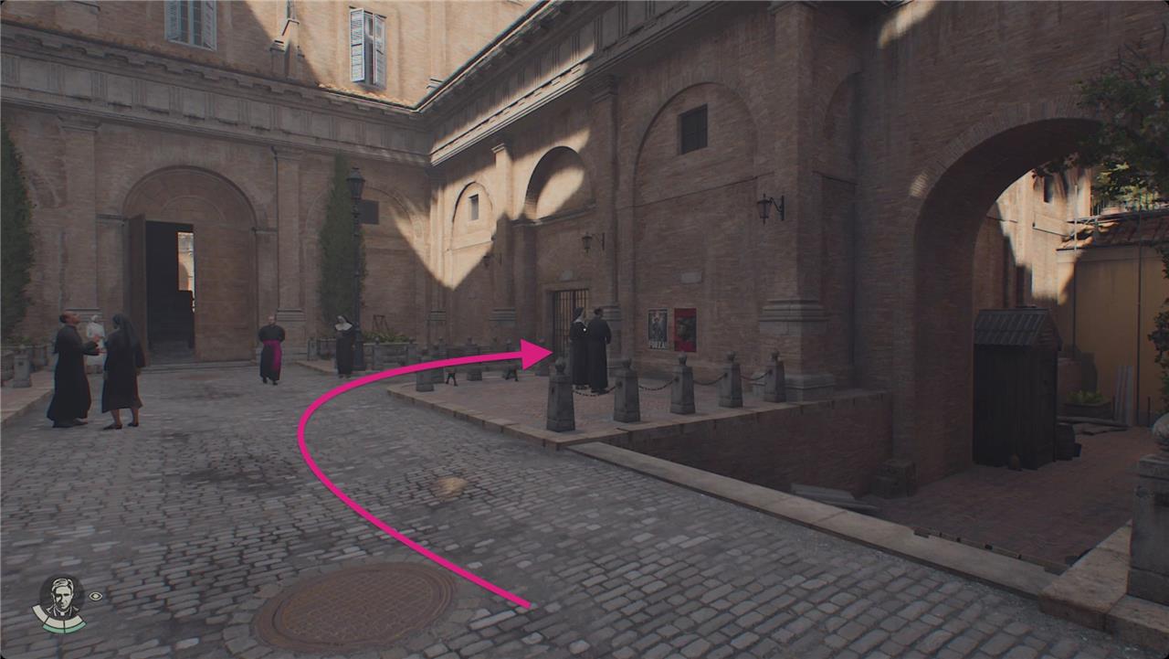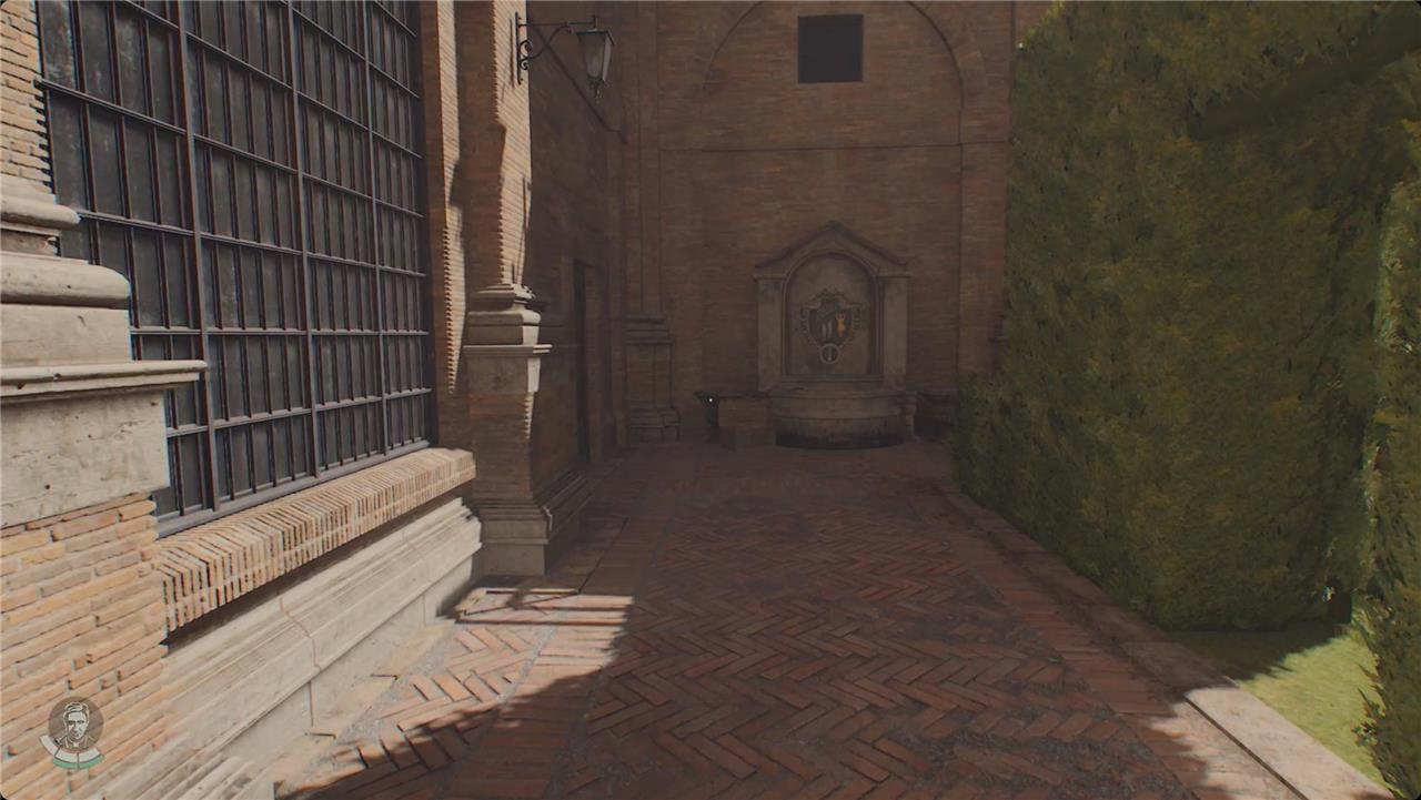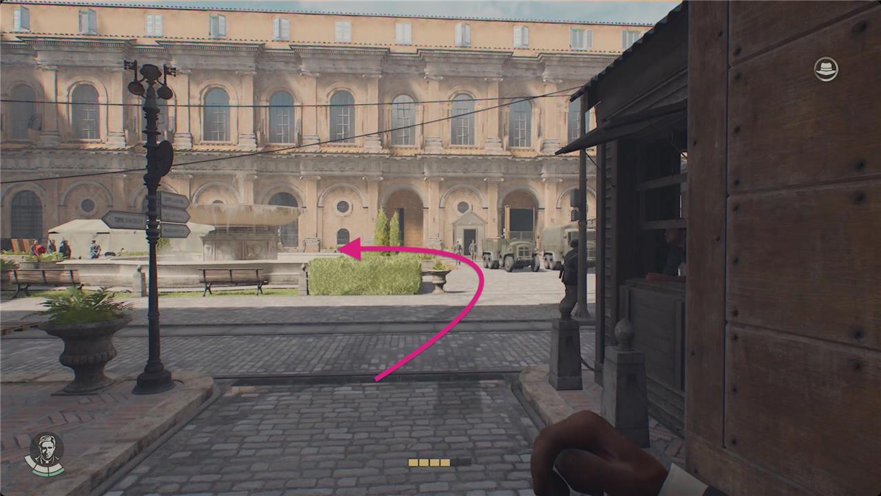From the fountain, head to the south end of Belvedere Courtyard. The Blackshirts are building a stage of some sort there. Head to the right side of the stage and sneak around to the back.