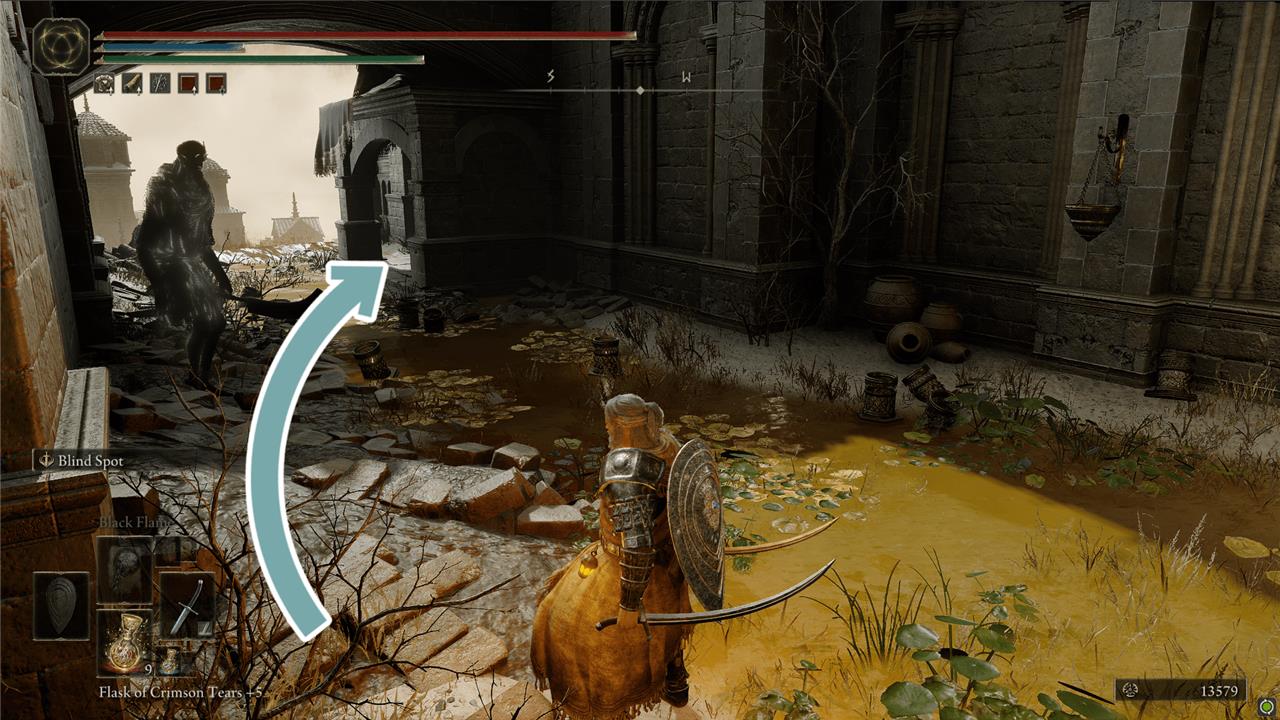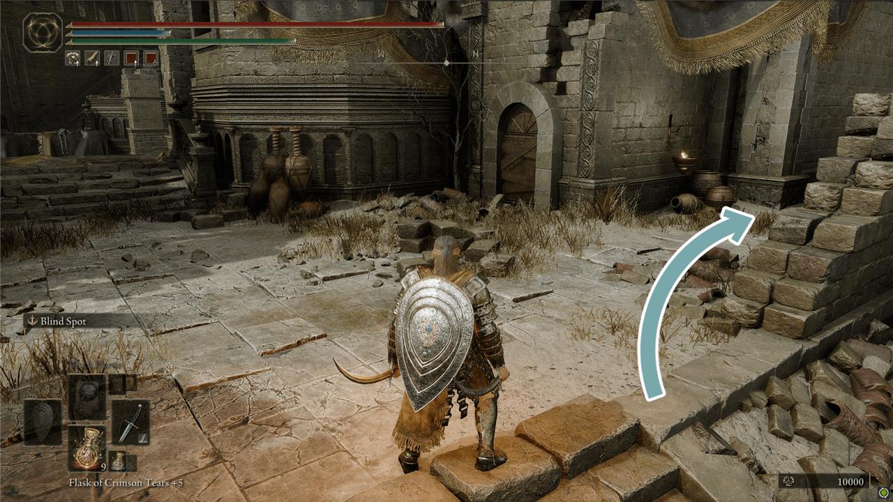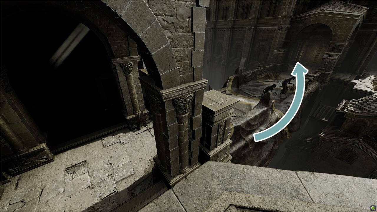 From the Small Private Altar Site of Grace, head north and up the stairs. Take out the Horned Warrior, and then turn left. You’ll be at the top of the waterfall that falls down to the fountain square from earlier in your exploration. Stick to the right (north), to find an alley that leads around to the other side – watch for Shadow Undead as you go.