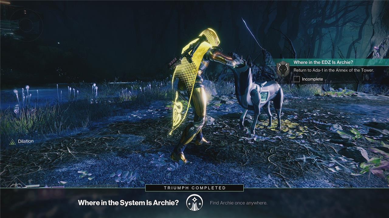 Once done, Archie is free. Offer “pawsitive reinforcement” (Bungie’s words, not ours – we cannot take credit), then revisit Ada back in the Tower to complete the quest.