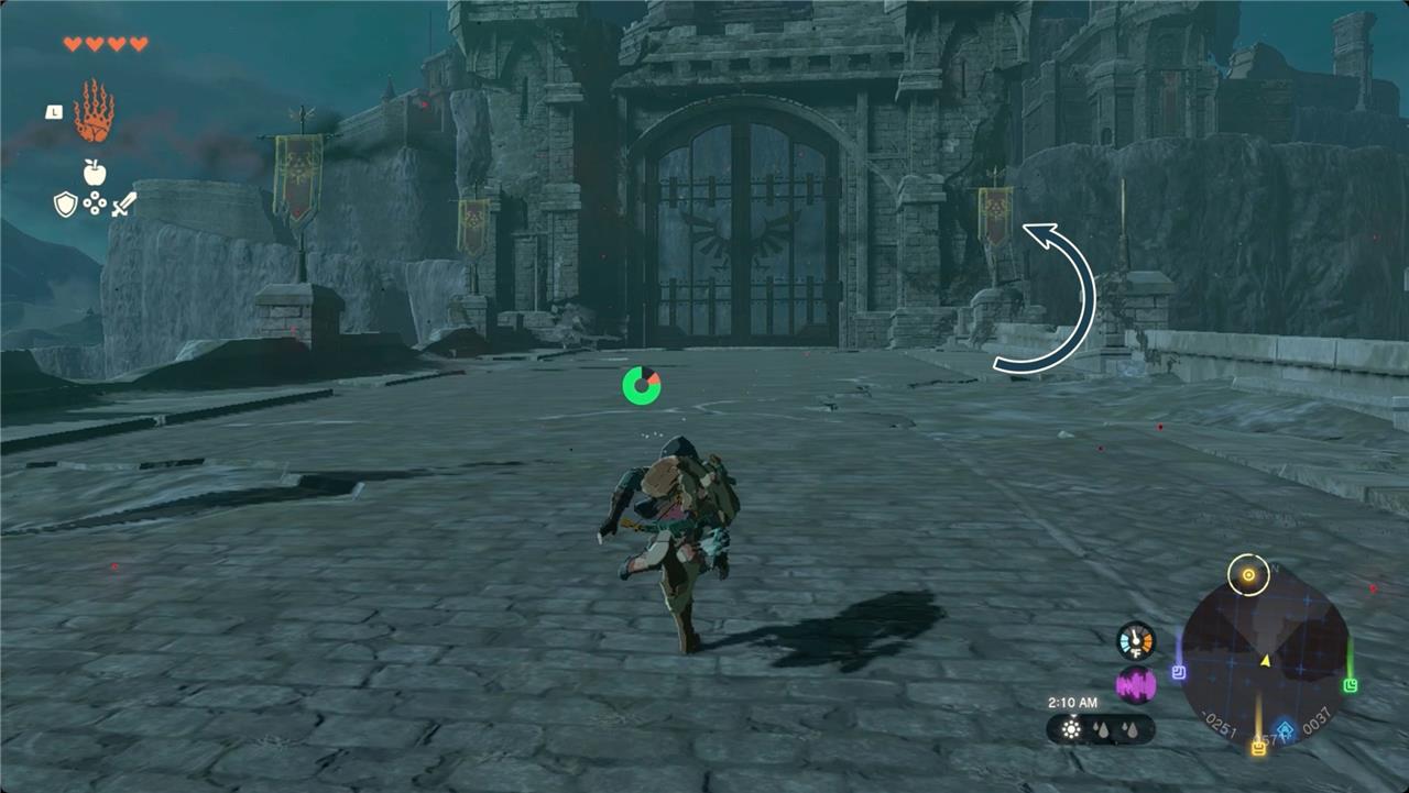 Approach the large castle gates (use Ultrahand to swing them open or climb left around them), then proceed up the sloped road to the First Gatehouse entrance.โ