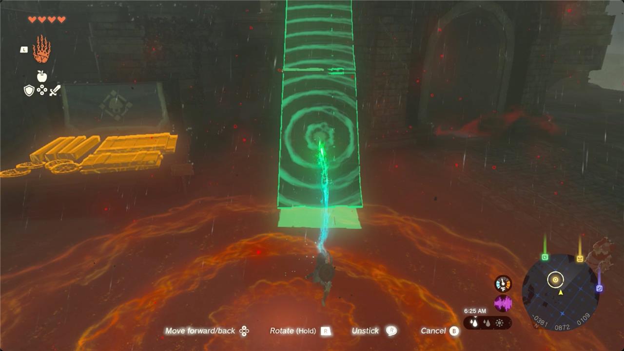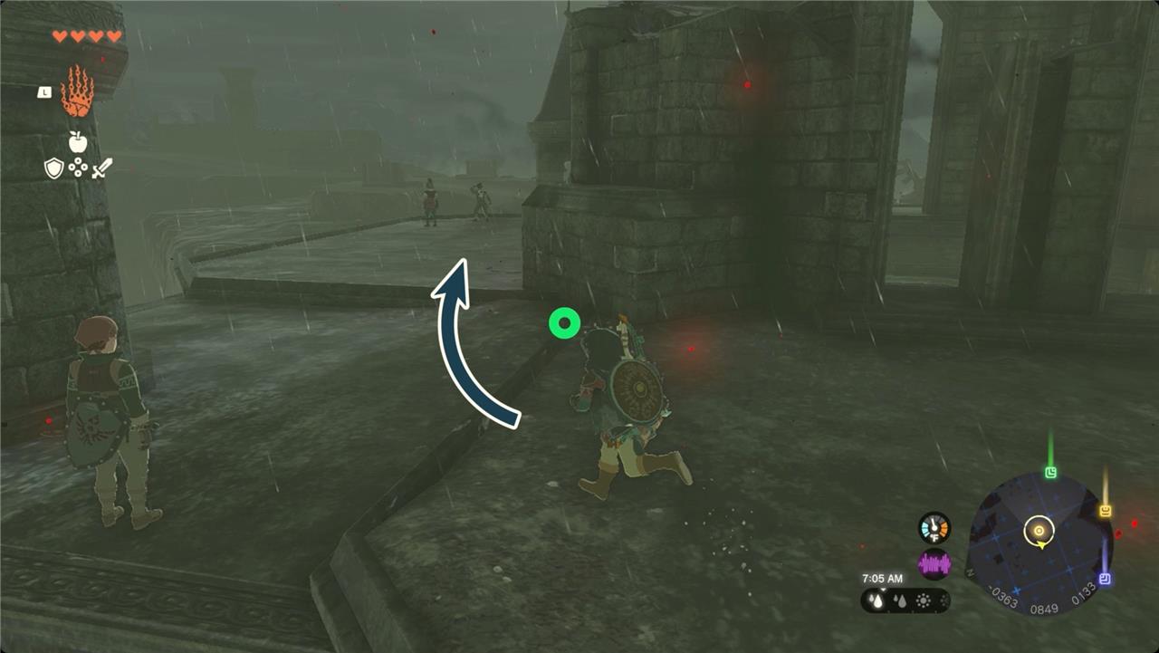 Grab two large wooden panels with Ultrahand and connect them end-to-end into a long ramp. Position it against the outer wall left of the entrance to scale the first ledge quickly, even in rain.โ