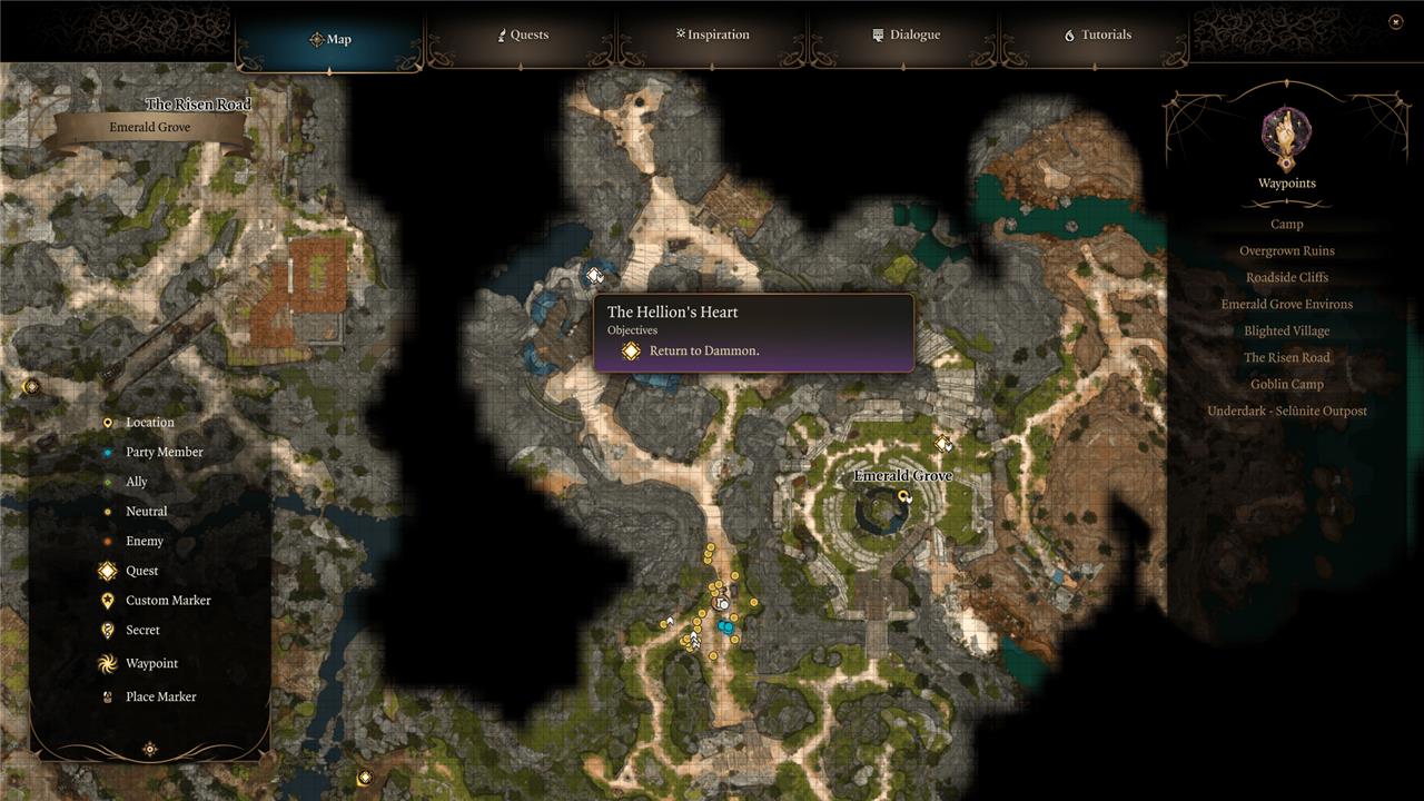 We successfully killed the Goblin Camp leaders and returned to Dammon when we met back up with Halsin in the Emerald Grove. And while the Tieflings were on their way out of town by then, Dammon was lagging behind a little bit, and was able to give Karlach a tune-up before he left. As long as you approach Dammon with the Infernal Iron before the Tieflings leave, you can progress Karlach’s quest during act 1. You can tell if Dammon is still in town or not based on the map icon for “The Hellion’s Heart” quest.