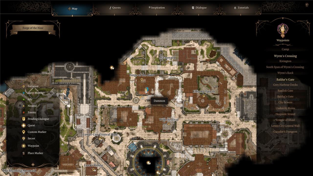 To find him, head to the northern half of the Lower city, on the eastern side of the map. Look for the Elfsong Tavern, where you’ll find some of the other Tieflings. Dammon is set up just to the west of there, on the southern balcony of the Forge of the Nine.