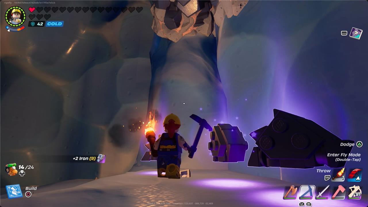To get iron in Lego Fortnite Odyssey, head to the Frostlands biome, which is a snowy area on the map. Inside the Frostlands, look for caves that have a blue glow around their entrances. Within these caves, iron appears as dark gray, lumpy ore deposits, often found in elevated areas that may require building stairs or ramps to reach. To mine iron, you need at least an Uncommon or Epic pickaxe, such as one crafted from obsidian slabs and frostpine rods. Be prepared for harsh cold and hostile enemies inside the caves by bringing torches, food, and cold resistance items like spicy peppers. Mining iron in these caves is essential for crafting Iron Bars, which are required for making powerful weapons and upgrading your village.