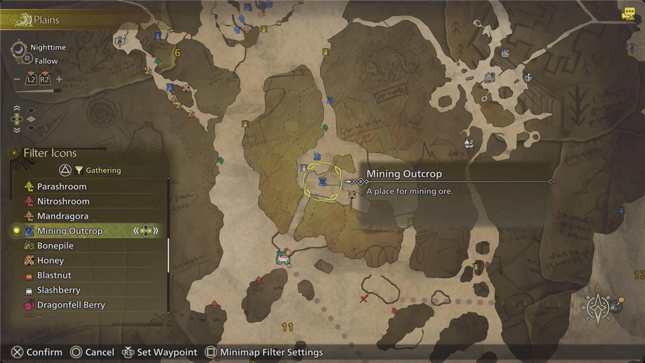 Use your map’s filter to highlight mining outcrops (blue icons) to plan your route efficiently and maximize your novacrystal haul.