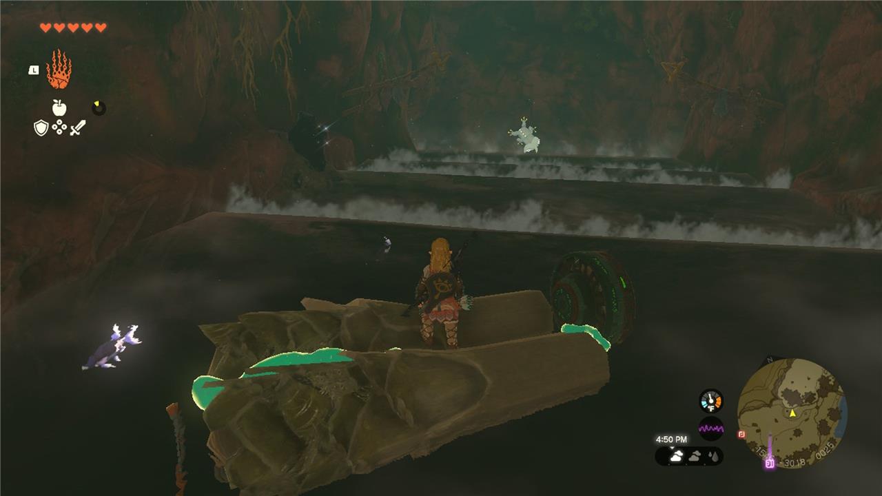The path leads you to an open chamber. To your right is an alcove blocked by vines, concealing a chest that contains a traveler’s shield. Grab that, then climb up the wall at the other end of the chamber. The path ahead is an incline with a Like-Like at the top. Watch out for its attack: spewing three large boulders in quick succession.