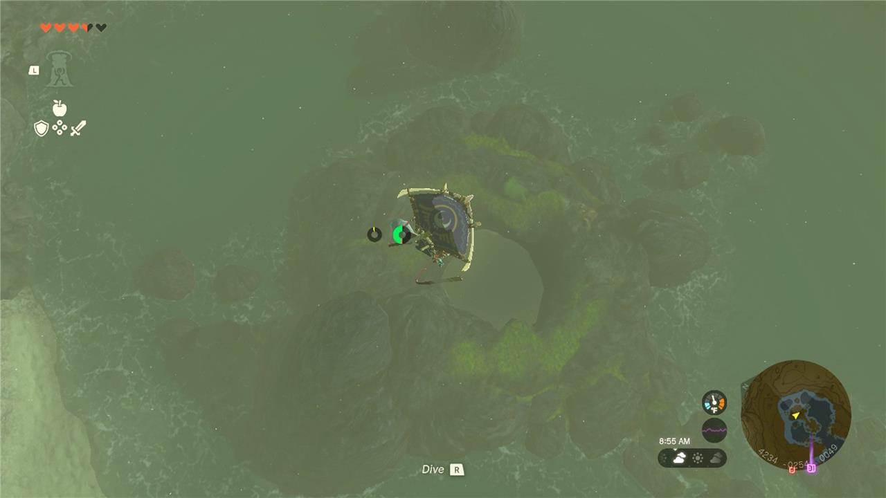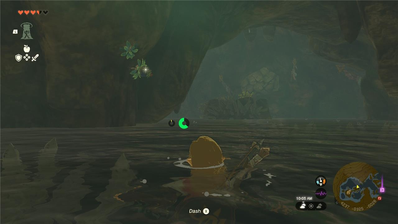 Glide down into the cave and swim until you reach a large rock. Stop there for a second to recover your stamina, then keep swimming ahead.