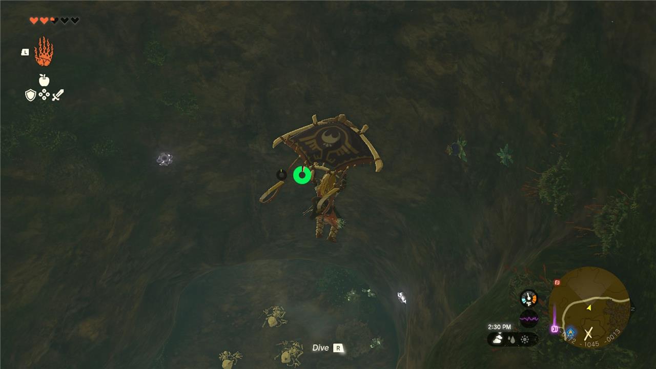 Launch from the tower southeast of the cave (unlocked early), glide northwest over Lake Floria. Aim for the marked cave entrance north of Lakeside Stable amid vines in Sarjon Woods; dive through clouds to conserve stamina and land directly.