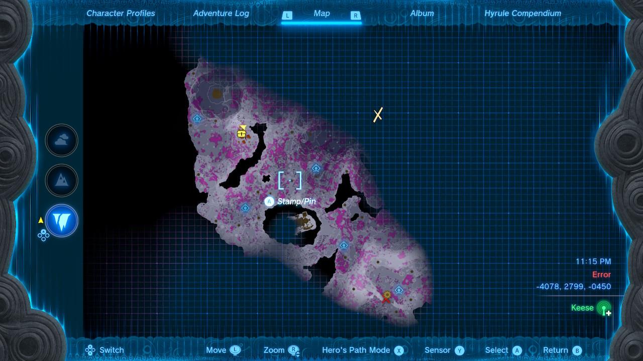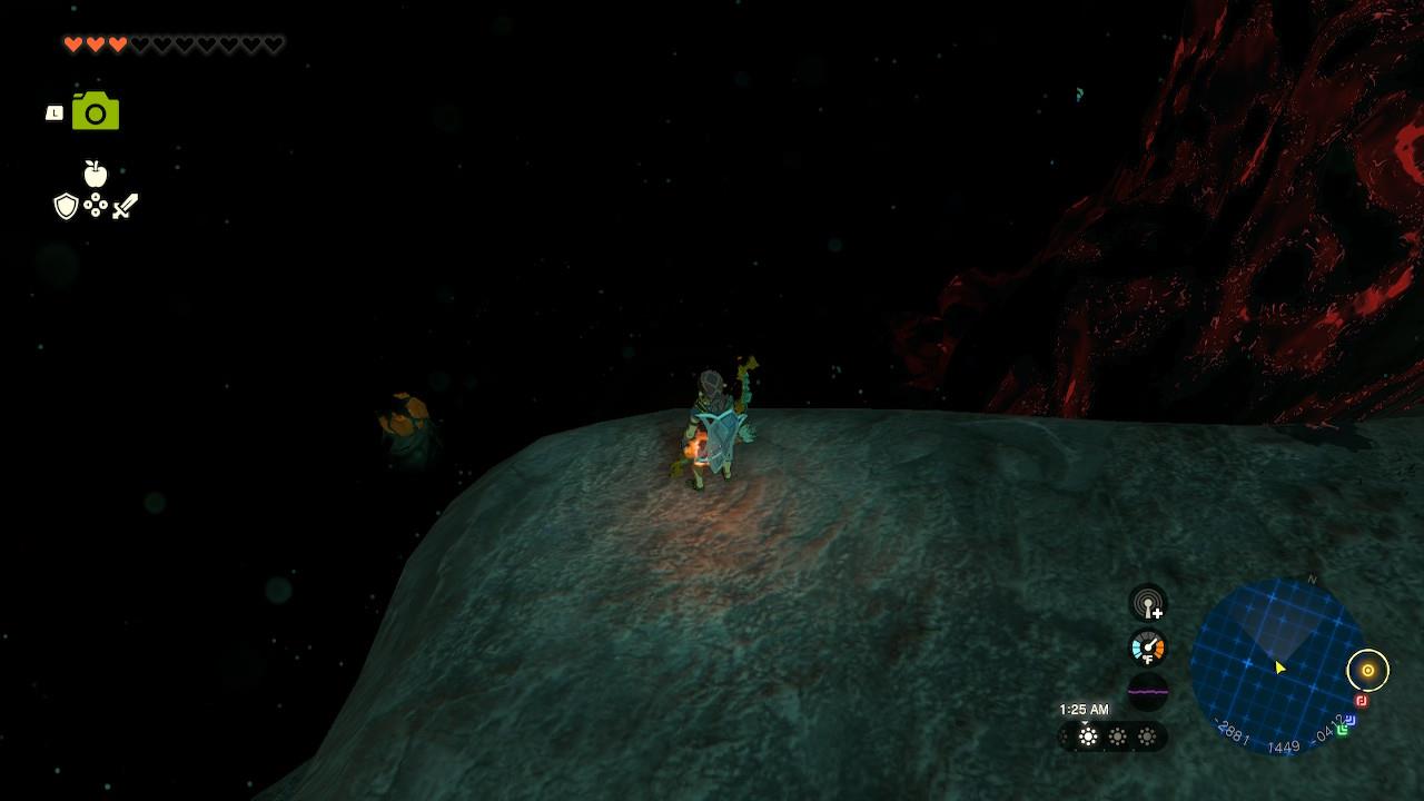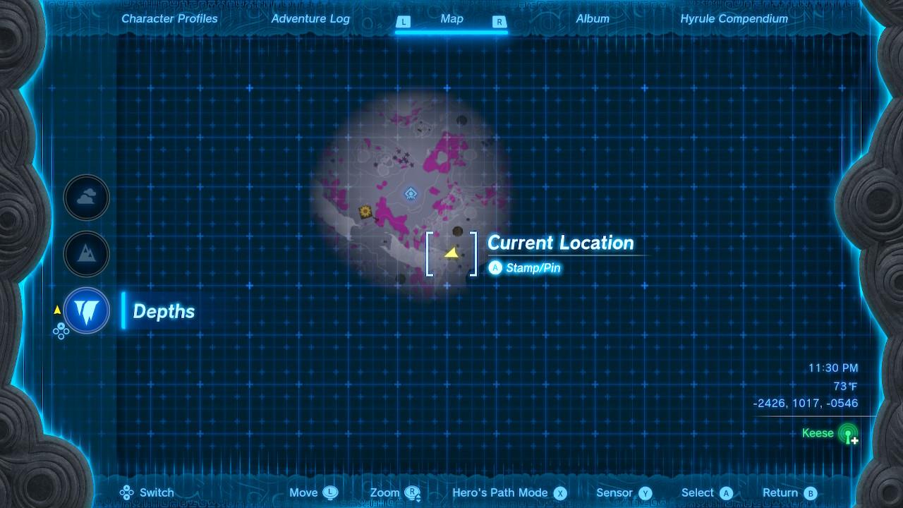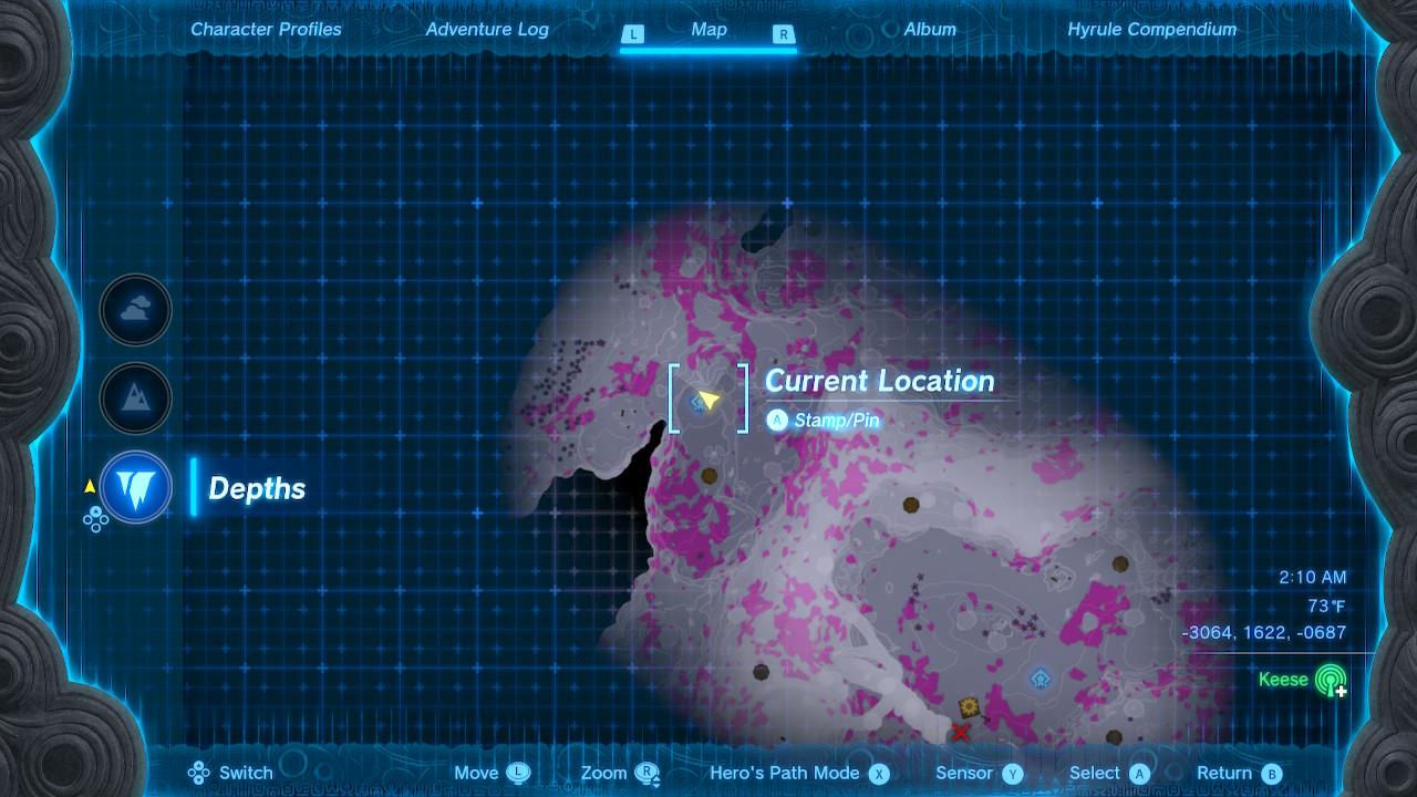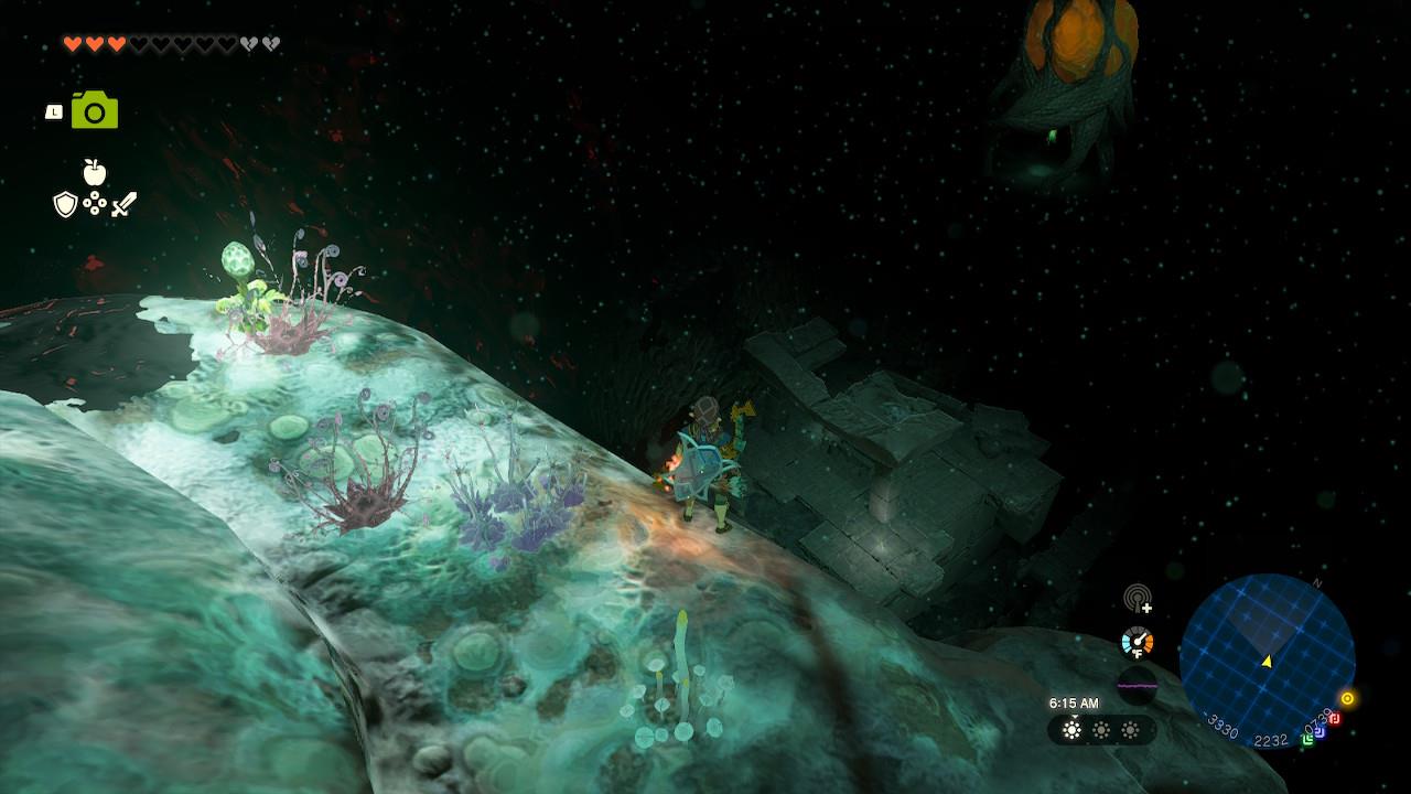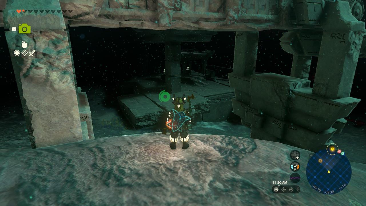 Map Pin: Central-north Depths under Hyrule Ridge; elevated ruins east of Tikanur Lightroot (-2531, 1168, -0623).โ
