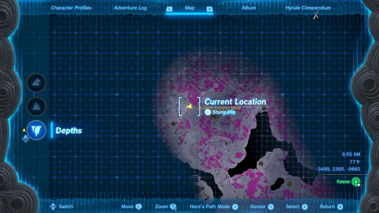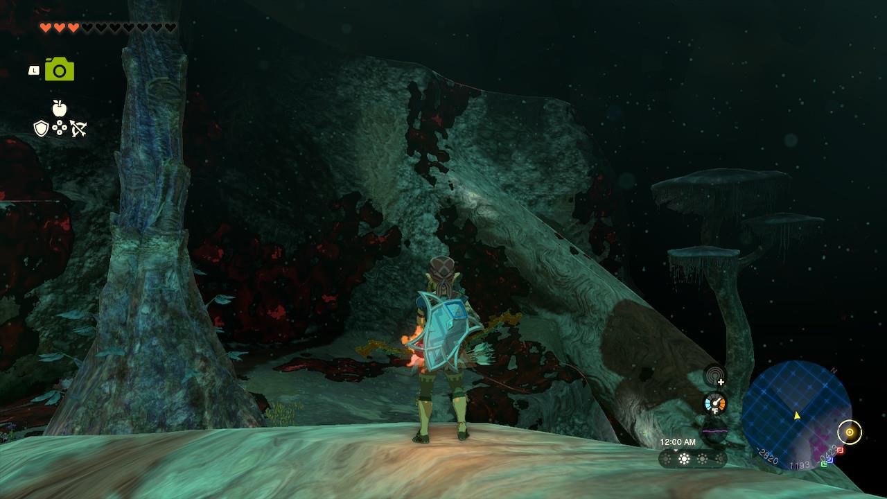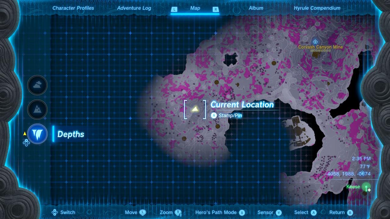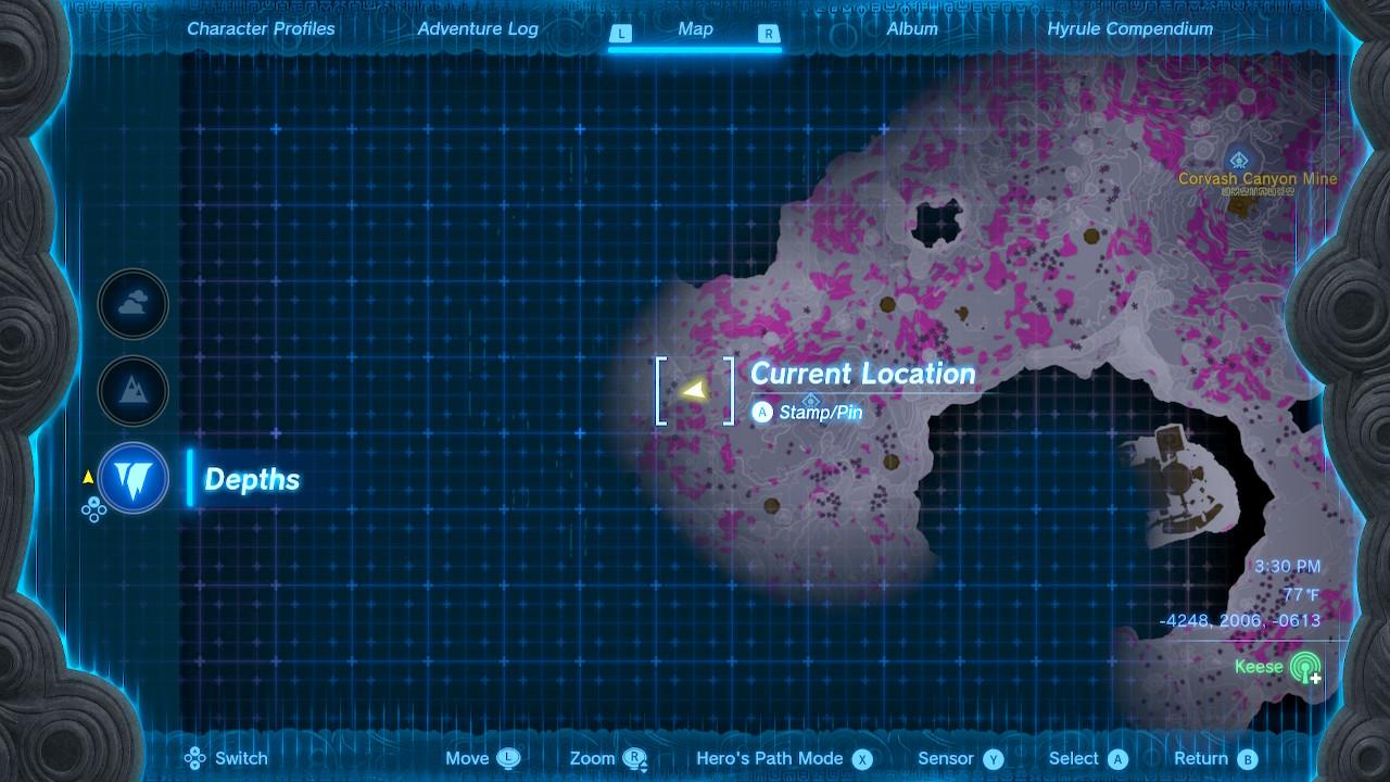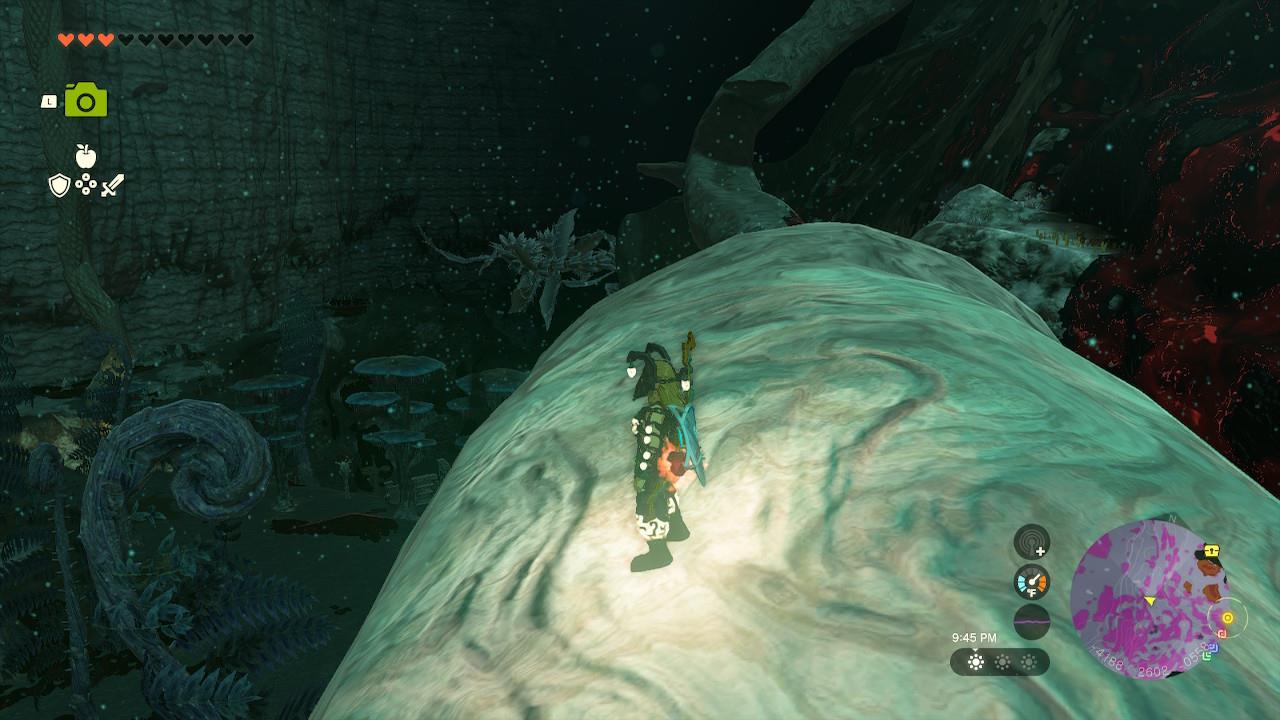 Map Pin: Central-north Depths under Hyrule Ridge; elevated ruins east of Tikanur Lightroot (-2531, 1168, -0623).โ