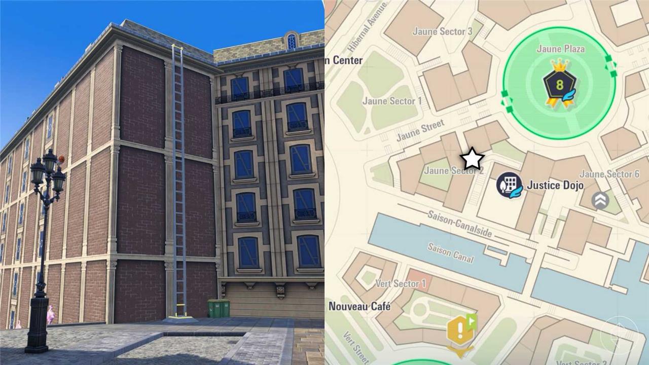 For the second location, you’ll want to head over to Jaune Sector 2, which is to the west of the Justice Dojo. We recommend starting from the Prism Tower and heading northwest. Once you reach the Saison Canal, take the northern path and go up the wide staircase. At the top of the staircase, turn left to find a ladder leading to the rooftop.