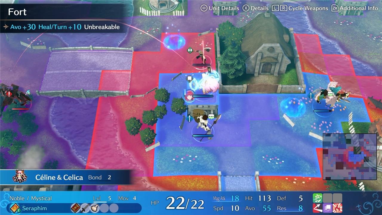 Every map will have some type of terrain that can help or hinder you. Stand in a thicket to gain 30 avoidance, which reduces your chances of being hit. Stand on forts to gain 30 avoidance, heal 10 HP a turn, and gain the unbreakable status, allowing you to counterattack regardless of weapon type. Keep an eye out for all of the different terrain types because they can change how you battle the corrupted enemies and turn the tides of battle into your favor.