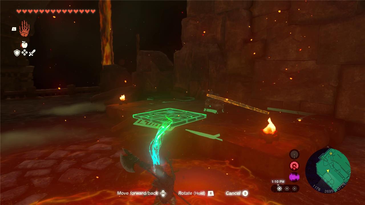Use Yunobo to break the marbled rock in the lava and activate Recall on the stone plates that are drifting down the lava bank. Ride the plates to the other side. Defeat the construct and hit the gong with Yunobo.