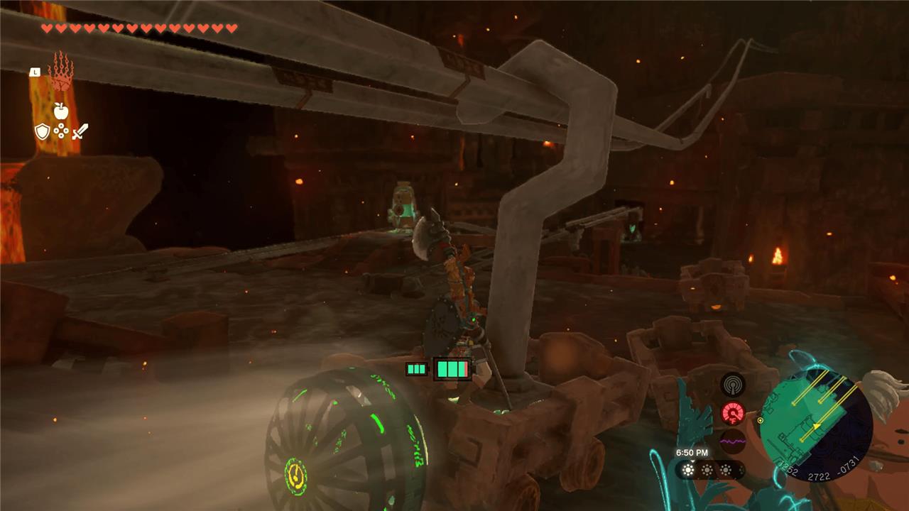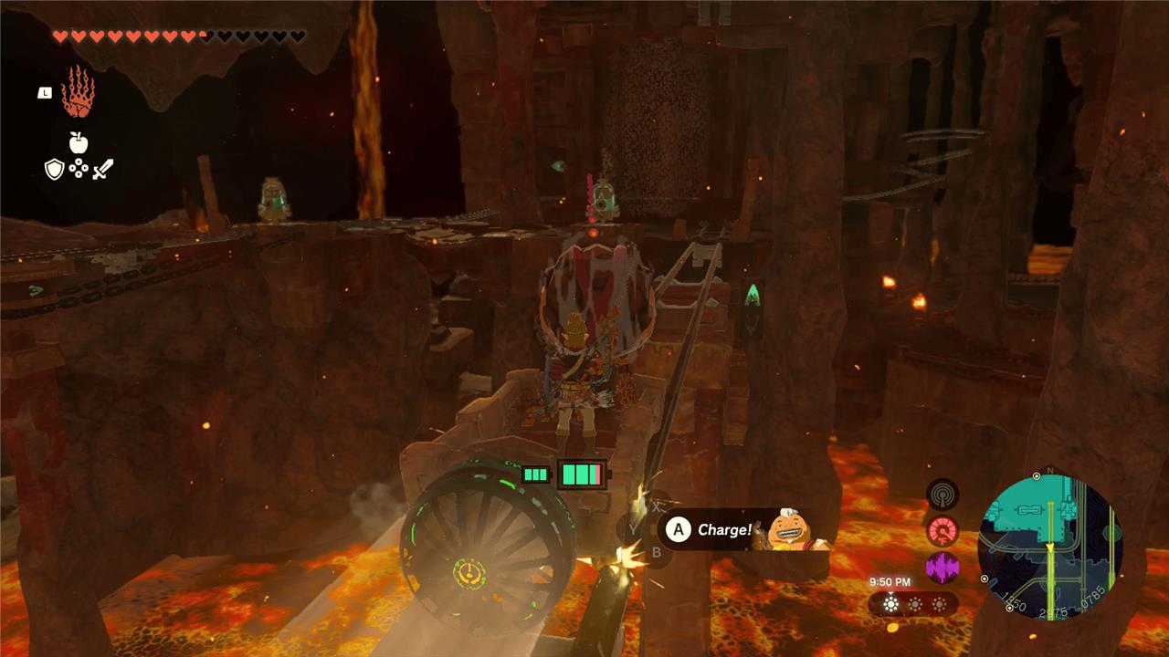 The Fire Temple begins deep within the volcanic depths of Eldin, where heat and magma dominate every corner. Activate the nearby mine carts to travel across rails suspended over rivers of lava, and keep your fire-resistant gear or elixirs active at all times. Your goal is to ignite the five locks scattered throughout the temple using Yunobo’s rolling ability, clearing out enemies that guard each path. Many puzzles revolve around rail switches, breaks in the tracks, and timing Yunobo’s fiery charge to hit distant switches or destroy obstacles blocking your route.
