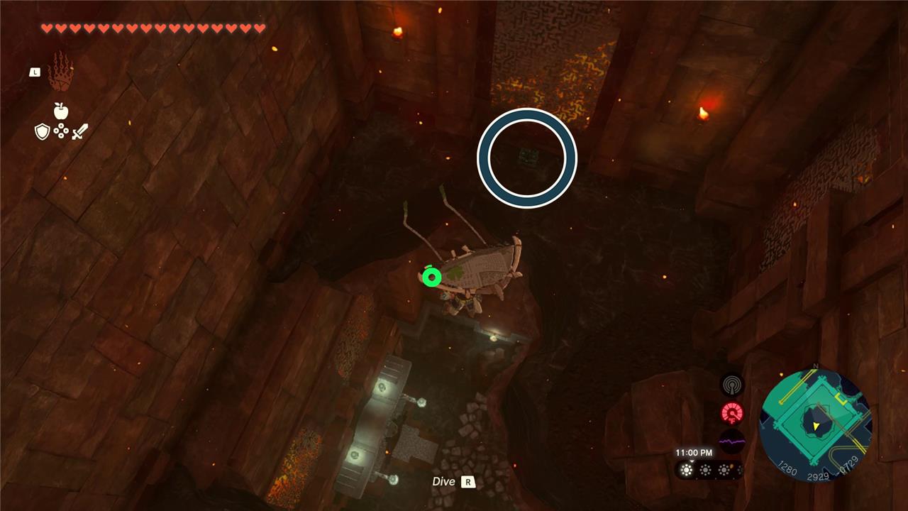 Head north from the Great Sky Island’s starting area to the volcanic island marked on your map. Glide down through the lava-filled crater using the gliding suit, aiming for the large stone door at the base. Activate the four gongs around the perimeter by striking them with arrows or melee attacks-Yunobo’s charge ability helps reach distant ones. Once all gongs ring, the door rumbles open, granting entry to the Fire Temple. Ascend the final platform inside via the elevator to begin the dungeon proper.