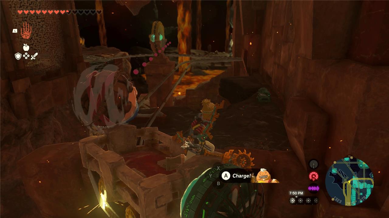 Ride the track again, and it’ll go up. Fight the construct and claim a whopping 10 arrows from the chest. Riding the nearby cart up will face you off against a construct in a cart, which you can just knock off with Yunobo’s charge.