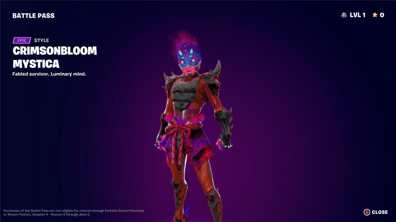 Mystica stands out with her ethereal, samurai-inspired style and glowing armor that shifts with celestial energy. Her design blends elegance and strength, giving players a mysterious presence on the battlefield. The outfit includes customizable options, from alternate color schemes to distinctive accessories, making her one of the most visually striking skins in the Fortnite Chapter 4 Season 2 battle pass.