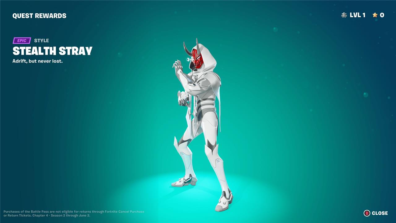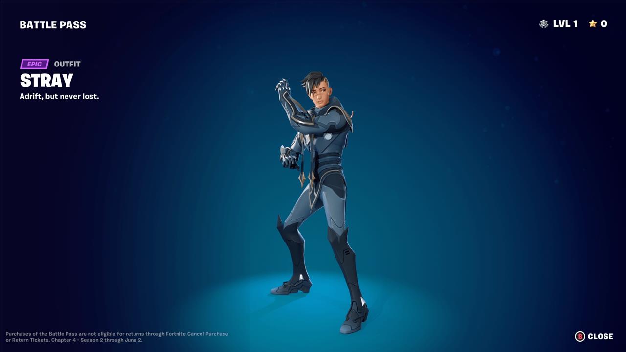 Stray brings a sleek, futuristic vibe to the Fortnite Chapter 4 Season 2 battle pass. His design mixes cyberpunk aesthetics with streetwear edge, featuring glowing accents and a feline-inspired mask. The character exudes confidence and agility, fitting perfectly into the season’s neon-drenched, high-tech theme. Players can earn different style options while progressing through the battle pass, giving Stray a bold visual evolution that stands out in each match.