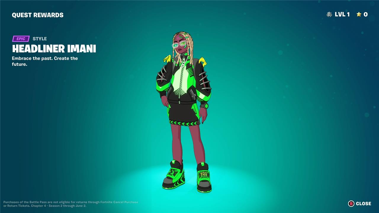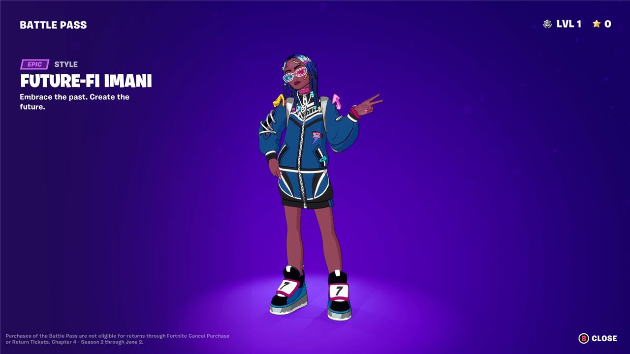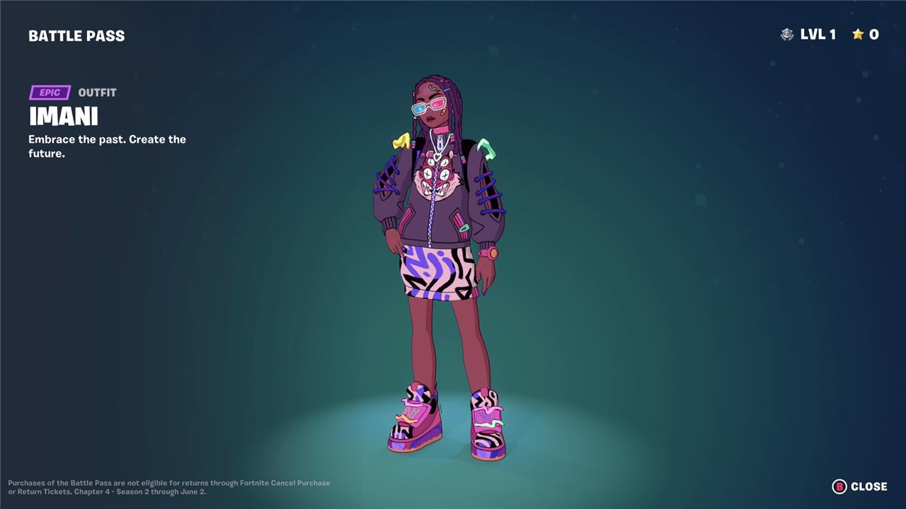 Imani brings a futuristic flair to the Fortnite Chapter 4 Season 2 battle pass. Her bold streetwear style blends neon colors with cyberpunk influences, giving her a striking presence on the island. The skin features reactive elements that highlight her animated design as players progress, making her stand out in fast-paced matches.