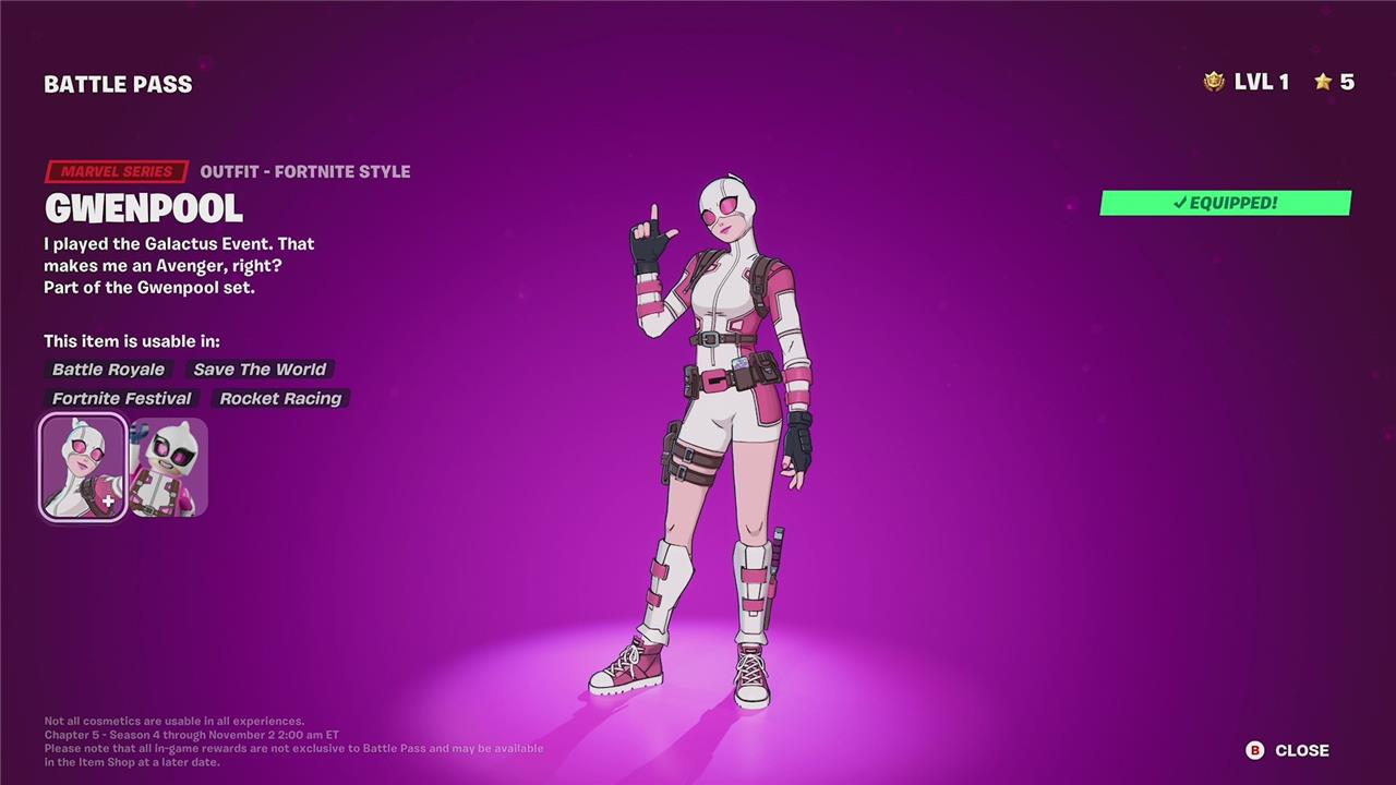 Gwenpool is the standout Tier 1 skin in the Fortnite Chapter 5 Season 4 battle pass, instantly available to all players who purchase the pass. Inspired by a fusion of Deadpool and Spider-Gwen, Gwenpool brings a vibrant, comic-inspired look and is accompanied by multiple unlockable styles. Players can customize her appearance with options such as toggling comic book outlines, switching between mask-on and mask-off looks, and adjusting shading effects for different color variations. Additional exclusive Gwenpool styles and upgrades can be earned by completing specific in-game challenges related to her set, allowing for further personalization as players progress through the season.