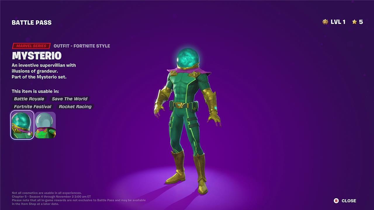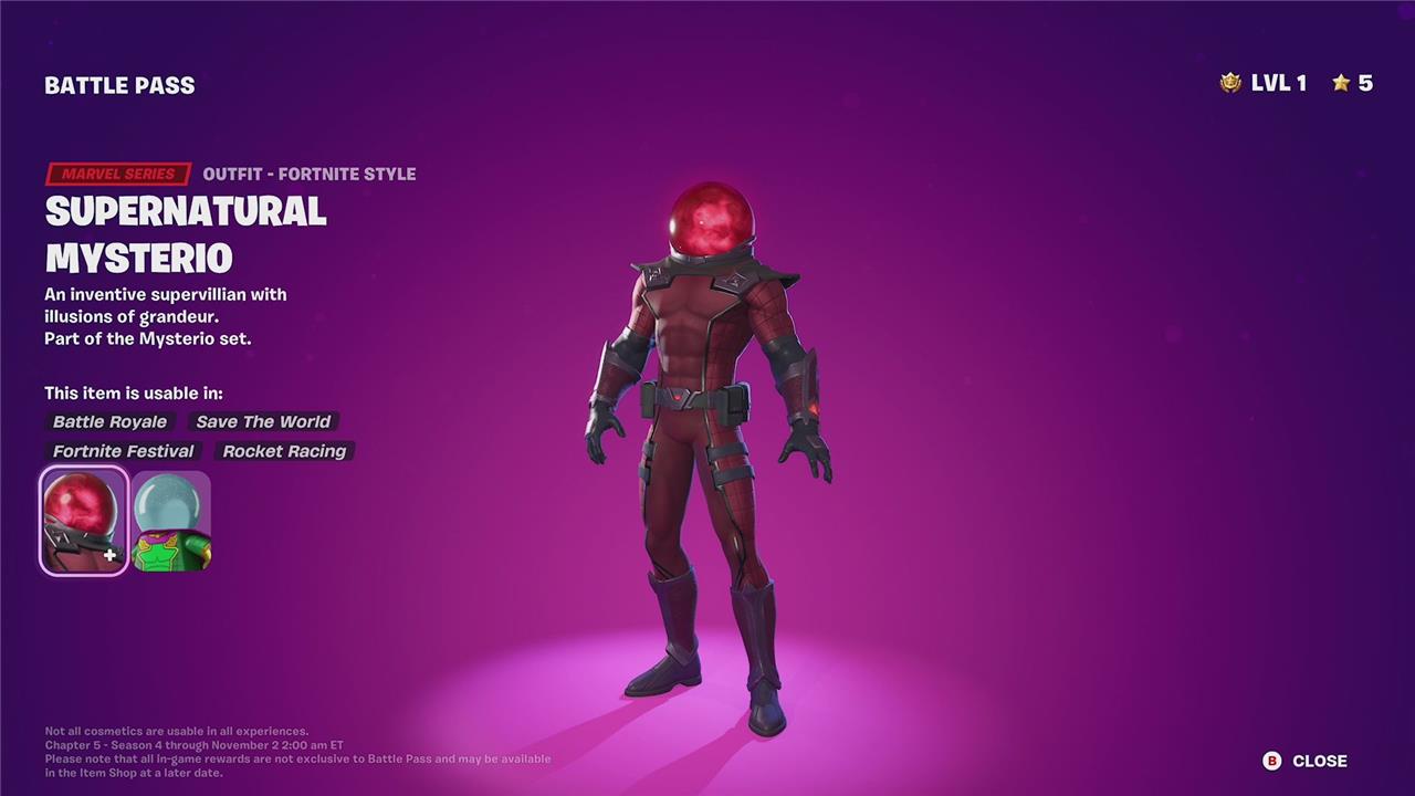 The Mysterio skin in Fortnite Chapter 5 Season 4 is an Epic Marvel Series outfit that players can unlock as part of the Battle Pass at level 80. It features multiple unlockable styles, including the default Mysterio, Supernatural Mysterio, and Illusory Mysterio, which can be obtained by completing related challenges and quests. The skin also comes with a mysterial cloak back bling and the Illusionist Blades pickaxe, both having their own style variations. Additionally, players can customize the globe effect on Mysterio’s helmet, choosing options like smoke or skull effects, adding to the skin’s illusion-themed aesthetic. Despite its rich customization options, Mysterio does not have a super level style in this season, which is unusual compared to other skins in the Battle Pass.