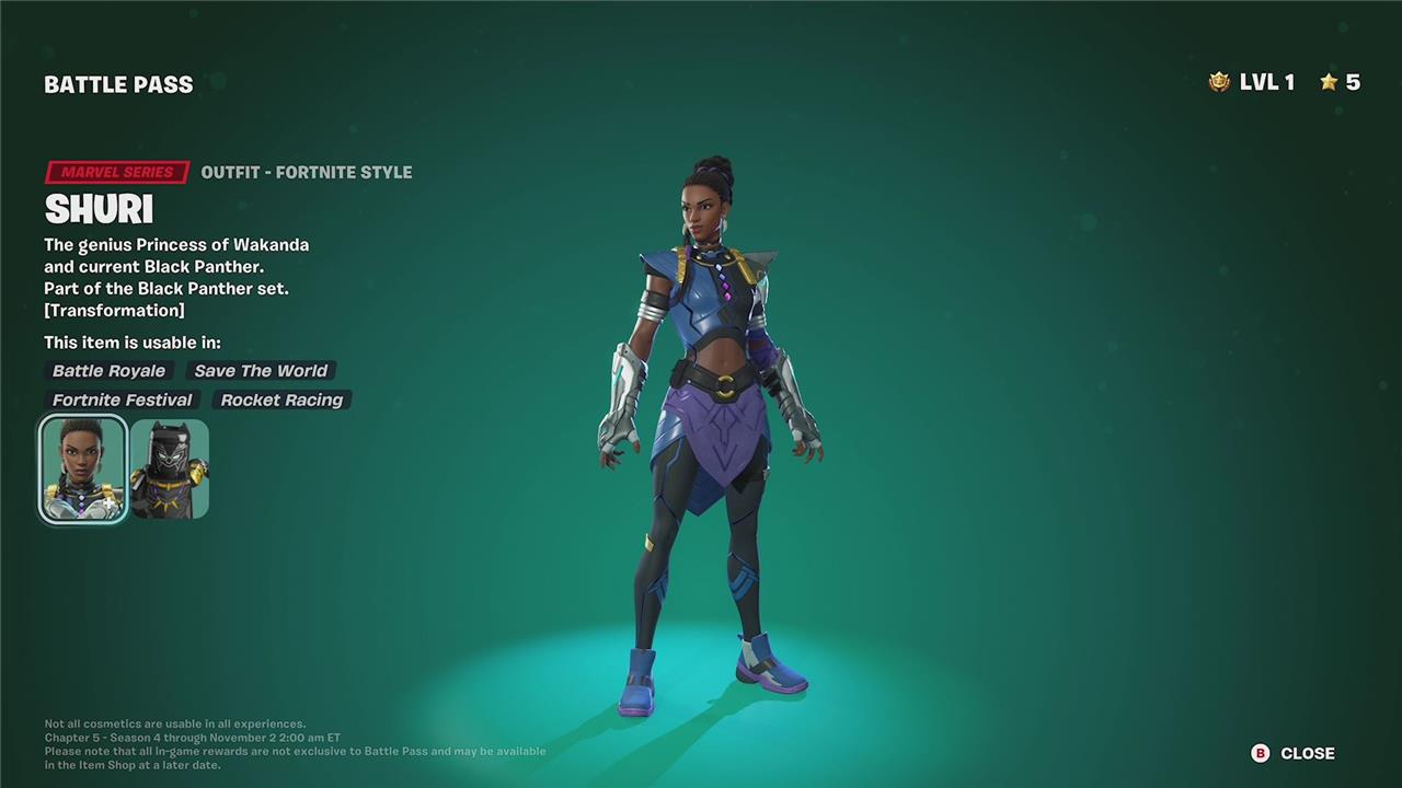 The Shuri skin in Fortnite Chapter 5 Season 4 is part of the Marvel Series and can be unlocked through the Battle Pass, specifically at Tier 86, with an additional style, “Take The Mantle,” available at Tier 94. As the genius Princess of Wakanda and the current Black Panther, Shuri’s outfit is not only visually striking but also features reactive elements that change based on in-game actions, such as dealing damage or opening chests. Players can unlock several styles for Shuri, including the base “Shuri” look, “Black Panther (Shuri),” and “Wakanda Royal Shuri,” with some styles obtainable as bonus rewards after completing the main Battle Pass progression. These styles offer both regular and glowing purple variants, reflecting Shuri’s connection to Black Panther lore and providing players with customization options as they progress through the season.