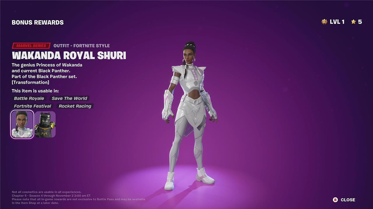 Unlockable style: Wakanda Royal Shuri (bonus reward after completing battle pass):