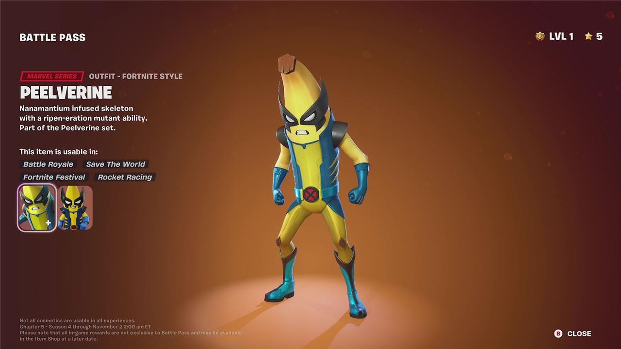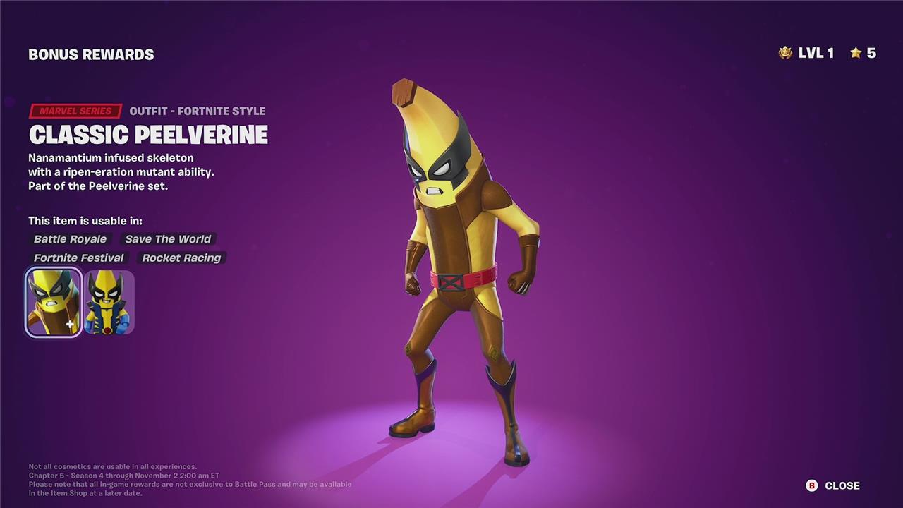 The Peelverine skin in Fortnite Chapter 5 Season 4 is a standout Marvel Series outfit that players can unlock by progressing through the Battle Pass and claiming rewards up to page 5. This skin features unique styles, including the classic Peelverine look and the X-Force Peelverine style, which can be unlocked by completing specific challenges and claiming bonus rewards on later Battle Pass pages. Players need to reach level 100 to access bonus rewards and level 200 for all rewards, ensuring they can unlock all Peelverine styles and related cosmetics such as back blings, pickaxes, and emotes. The Peelverine set includes multiple cosmetic items that enhance the character’s appearance and offer customization options for fans of the mutant-themed skin.