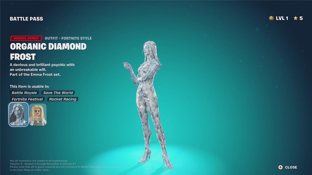 Emma Frost is a premium Marvel Series skin introduced in Fortnite Chapter 5 Season 4, available through the Battle Pass at level 45. This skin features her iconic white outfit, reflecting her comic book appearance, and is part of the Emma Frost set. Players can unlock multiple styles for Emma Frost, including the notable “Organic Diamond Frost” style, which highlights her mutant psychic powers with a crystalline diamond form. The skin’s unlockable styles allow customization that emphasizes her icy and powerful persona, making her a standout character in the Absolute Doom season lineup alongside other Marvel heroes and villains.