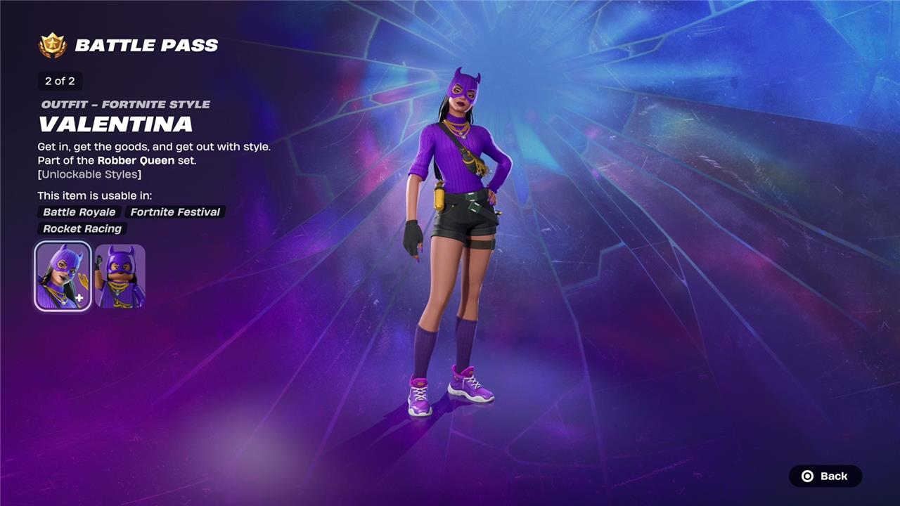 Valentina is a stylish cat-like thief featured in Fortnite Chapter 6 Season 2’s battle pass, embodying the season’s heist theme. She is unlocked on page 7 of the battle pass and comes with multiple styles, including the glamorous Hazardous Valentina, which can be obtained on page 8 or through the bonus track after completing the battle pass. Her design and alternate styles highlight her role as a cunning and fashionable outlaw within the “Lawless” season lineup.