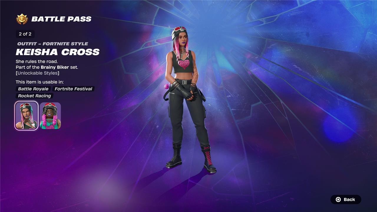Keisha Cross is one of the distinctive skins featured in Fortnite Chapter 6 Season 2’s battle pass. She is portrayed as a biker, fitting the season’s outlaw and heist theme, and comes with multiple styles that players can unlock as they progress through the battle pass tiers. Her design complements the gritty, rebellious vibe of the season, adding a dynamic and edgy character option for players who enjoy a tough, street-smart aesthetic in their gameplay.