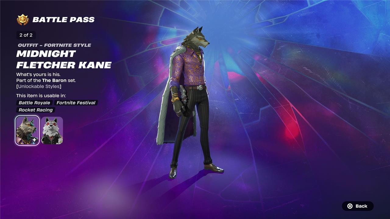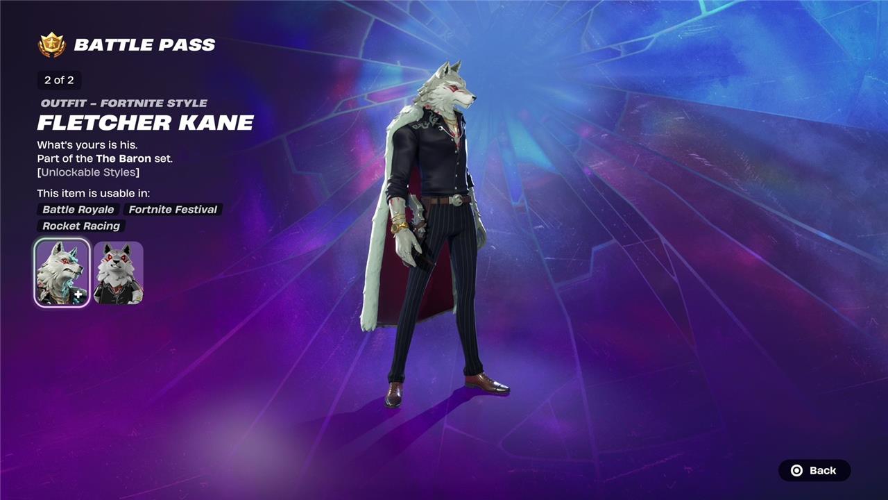 Fletcher Kane is a key skin in Fortnite Chapter 6 Season 2’s battle pass, portraying a dapper wolfman and crime lord fitting the season’s “Lawless” heist theme. Players unlock the base Fletcher Kane skin on page five of the battle pass, with additional styles such as “Midnight Fletcher Kane,” which offers a darker aesthetic, available on page six and in the bonus track after completing the battle pass. His cosmetics include themed items like the Lone Wolf Holster back bling and Fletcher’s Cane pickaxe, emphasizing his mob boss persona. These styles provide players with versatile looks to embody the character’s villainous role in the season’s narrative.