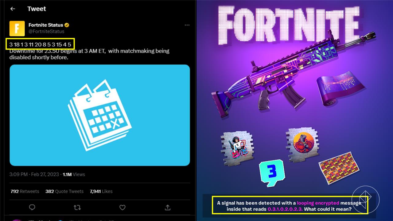 The Fortnite Status Twitter account posted a Twitter about when the downtime for patch 23.50 will begin, but it also included a cipher at the beginning of the tweet: “3 18 1 3 11 20 8 5 3 15 4 5.” If you substitute the numbers in the sequence with their respective letter in the alphabet, you’ll get “Crack the code,” which means that players will have to do that for the names of the quests themselves. However, there’s an extra step that you can find in Fortnite when you’re looking at the Cipher quests. You must subtract the numbers in the looping sequence found in the message on the quest page (0.3.1.0.2.0.2.3) from the number sequence in each of the quest names. (The first number in the looping sequence should be subtracted from the first number in the quest name sequence, and so on.) After you subtract the numbers, substitute the numbers with the letters of the alphabet to find the true code.