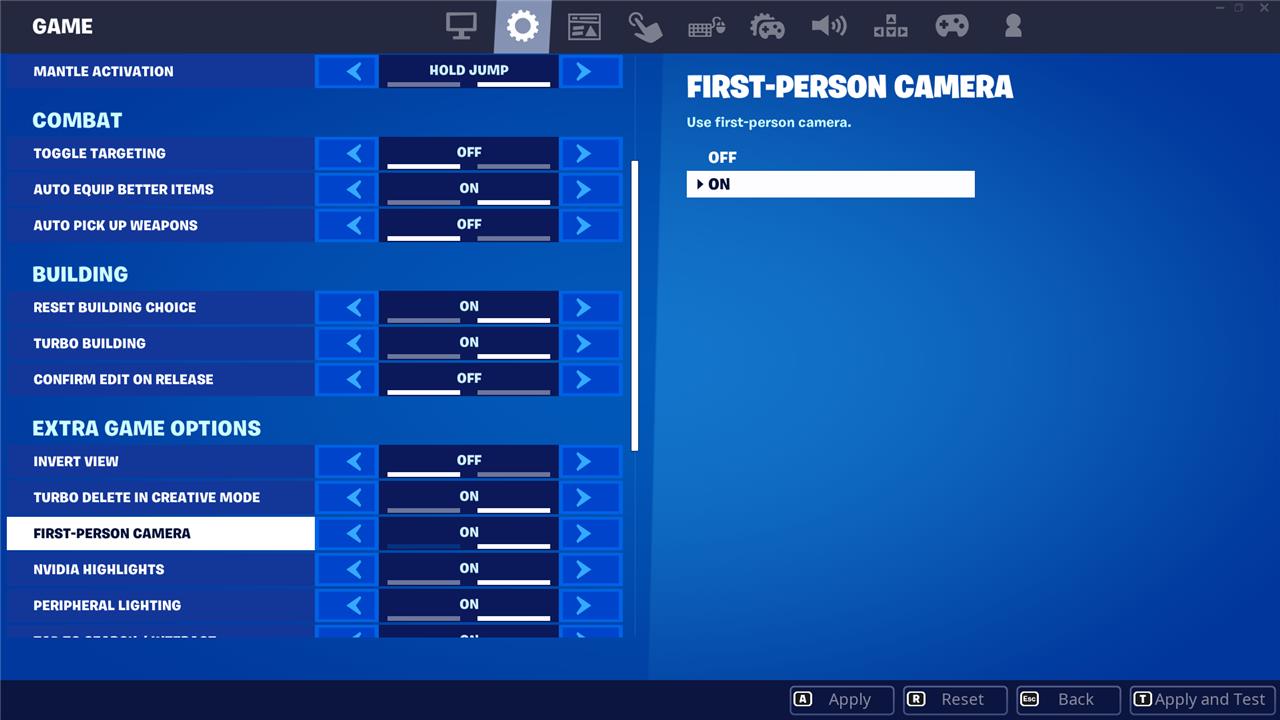 - In the “game” settings, toggle to turn on the “first-person camera” under the “extra game options.”