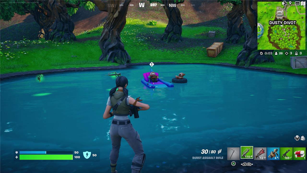 There is a collapsed warehouse on the north side of Dusty Divot. Down the hill from there, you’ll find a small pond. The gnome is chilling on a pool float in the middle.