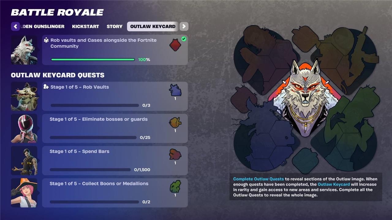 Completing Outlaw Keycard quests will upgrade your keycard – giving you access to more weapons and items in the backrooms with each tier. To see your Outlaw Keycard tier and progression, open the “The Outlaw Keycard” banner located in the Battle Royale quests tab.