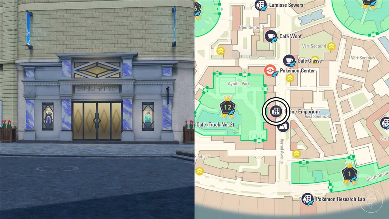 The Stone Emporium in Lumiose City is located on Vernal Avenue in Vert Sector 9, which is in the southern part of Lumiose City. To find it, you can head south from the Prism Tower, go straight down the main road, and the store will be on the right side. It is near the Pokémon Research Lab to the south and Café Woof to the north. The Stone Emporium sells evolution stones, fossils, and Mega Stones, with some items unlocking as you progress through the game.​